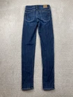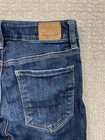 The product is a pair of American Eagle women's jeans in size 0 long, featuring a skinny slim fit in a dark wash denim with stretch for comfort. Made from a cotton blend fabric, these jeans have a classic solid pattern with a zip closure and a 5-pocket design. The brand is American Eagle Outfitters, known for their quality and stylish denim bottoms. Perfect for any season, these jeggings are machine washable and perfect for everyday wear.