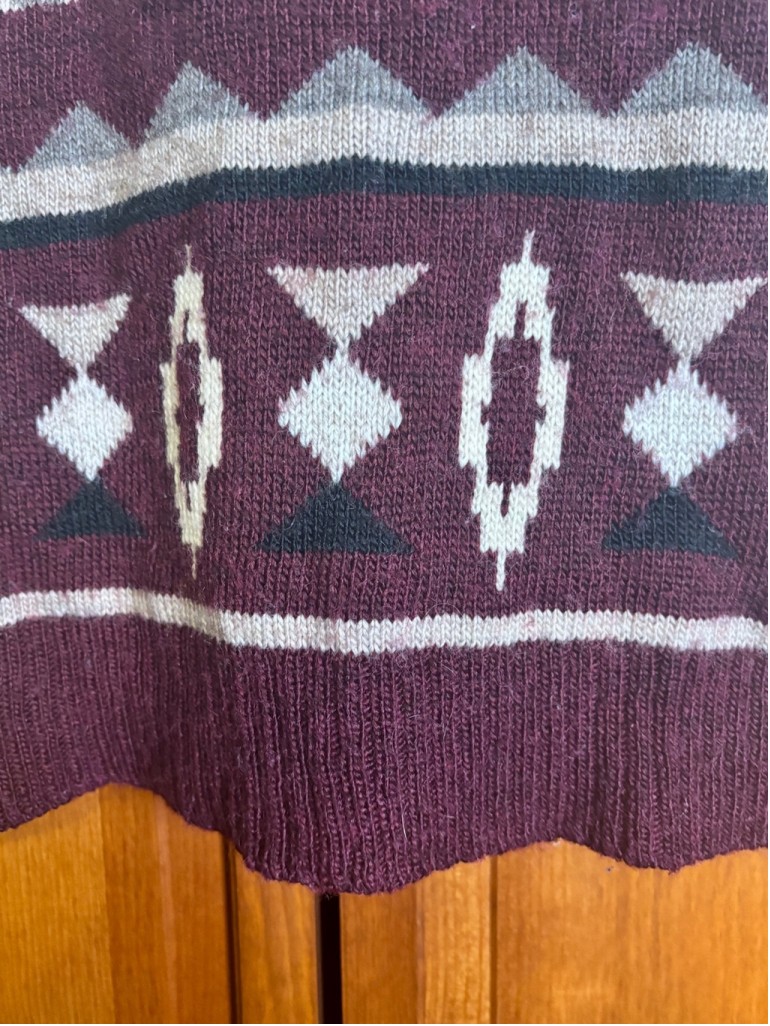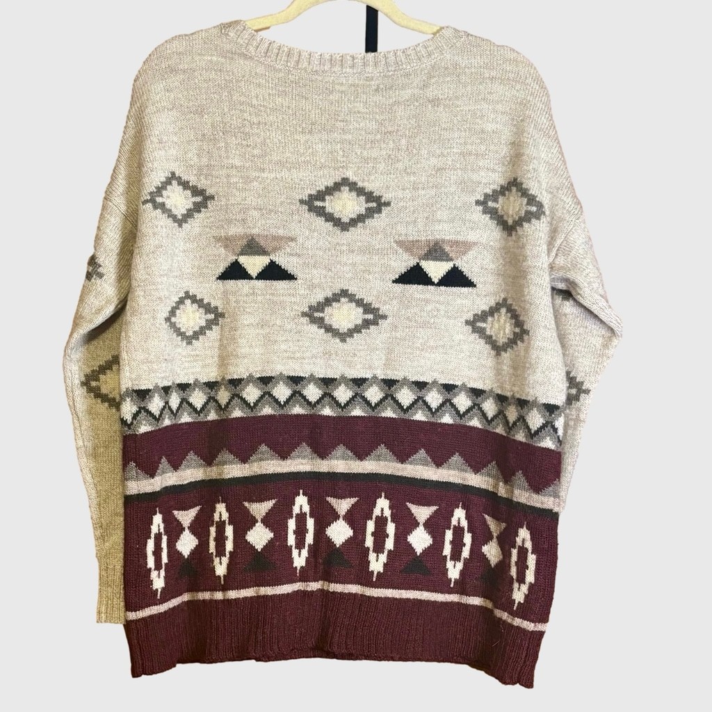 American Eagle Outfitters Fair Isle Wool Blend Sweater Beige Burgundy L Classic and cozy, this American Eagle Outfitters sweater features a Southwestern-inspired Fair Isle pattern in soft tones of maroon, grey, and cream. Crafted from a warm wool-blend knit, it offers a relaxed fit and timeless style that’s perfect for fall and winter layering. **Details:** - **Brand:** American Eagle Outfitters - **Size:** Large - **Color:** Beige and Burgundy - **Material:** 45% Acrylic, 30% Polyester, 25% Wool - **Condition:** Excellent Pre-Owned - **Made:** October 2015 - **Pattern:** Southwestern / Fair Isle - **Care:** Machine wash cold, gentle cycle; lay flat to dry **Key Features:** - Soft wool-blend knit for comfort and warmth - Classic Fair Isle pattern in neutral earth tones - Relaxed fit with traditional crew neckline - Midweight design ideal for layering - Timeless American Eagle style Perfect for pairing with jeans, leggings, or a casual skirt — this cozy sweater brings effortless comfort and classic charm to your cold-weather wardrobe. Ships Fast! #AmericanEagle #FairIsleSweater #WoolBlend #WinterStyle #CozyKnit #ClassicSweater #AEStyle