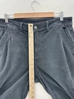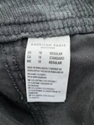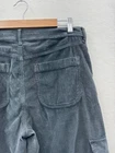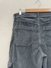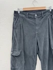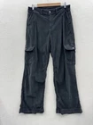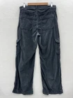 Small tear at one of the front belt loops. Could be repaired. These American Eagle Women's 10 High Rise Baggy Wide Leg Corduroy Pants in black are designed for travel or casual occasions. Made of a comfortable and stretchy fabric blend of spandex, lyocell, and cotton, these cargo pants feature a high rise and wide-leg style with cargo pockets for a retro Y2K look. The pants have a button and zip closure with a flat front and a waist size of 34 inches, making them a stylish and practical choice for the winter, fall, and spring seasons.
