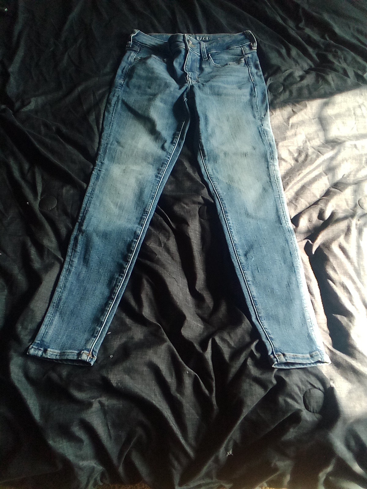 These American Eagle Women's Blue Jeans in size US 4 Short are a stylish addition to any wardrobe. Made of cotton denim with a solid pattern and medium wash, they feature a regular fit and skinny style. The jeans have a zip closure, 5-pocket design, and are machine washable for easy care. With accents like buttons and stretch fabric, these jeans are versatile for all seasons and are perfect for any casual outfit. The American Eagle brand ensures quality and a trendy look that is both classic and on-trend.
