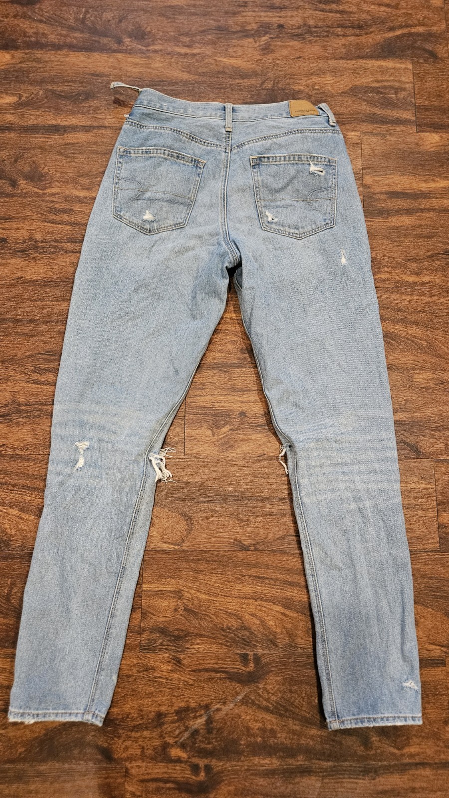 American Eagle Women's Light Wash Distressed Mom Jeans Size 6 X-long. There is one belt loop that is broken