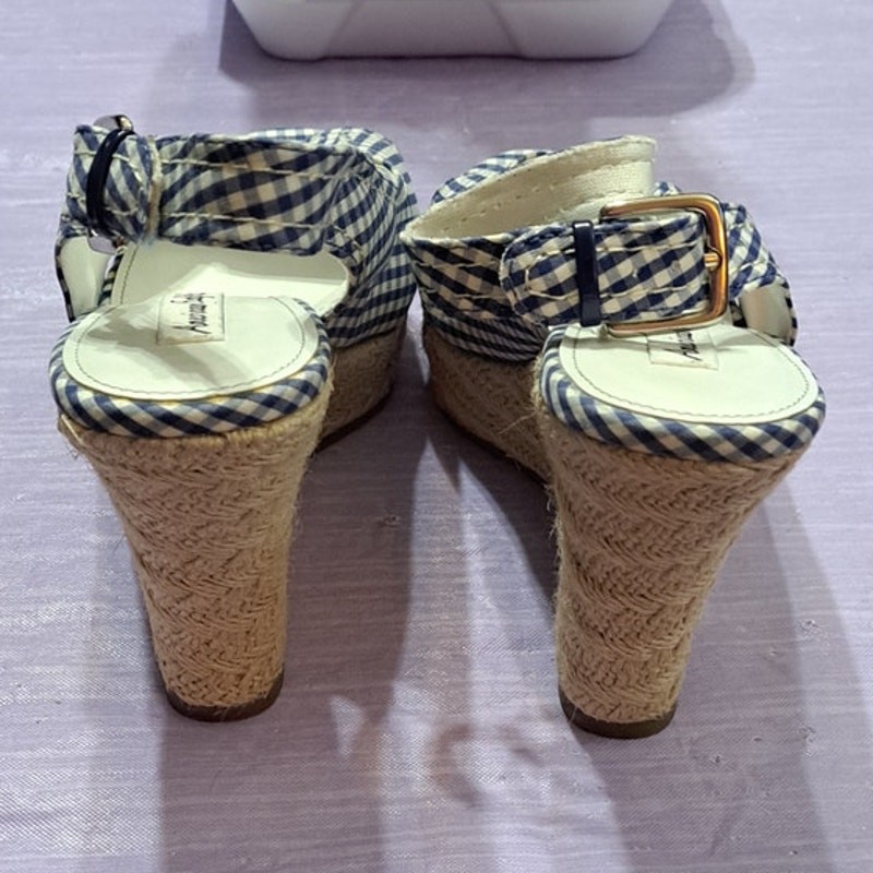 New American Eagle Women's Platform Sandal Roped Wedge Blue & White Checker Size 8. These are new with tags. There is a glue flaw on the heel as shown on last photo. (I think your heel would cover that when you're wearing these) Will ship fast and with care!