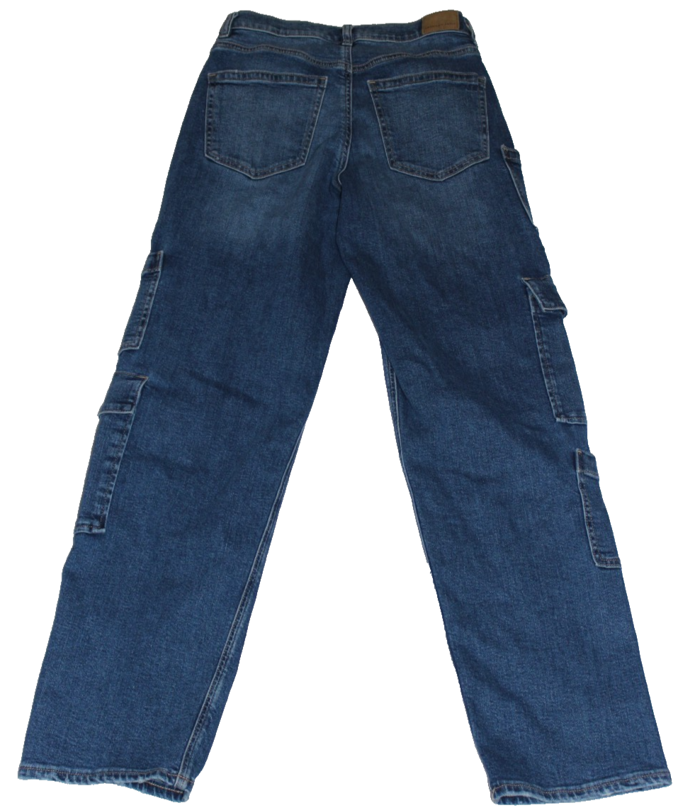 The American Eagle Women's Super High Rise Baggy Straight Jeans in size 2 are a stylish and comfortable choice for any season. These jeans feature a mid-rise with a relaxed fit, making them perfect for a casual yet trendy look. The distressed detailing and cargo pockets add a touch of edgy style, while the stretch fabric ensures a comfortable fit. With a classic straight leg style and a solid blue color, these jeans from American Eagle are a must-have for any wardrobe.