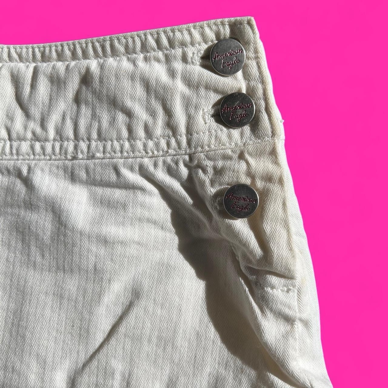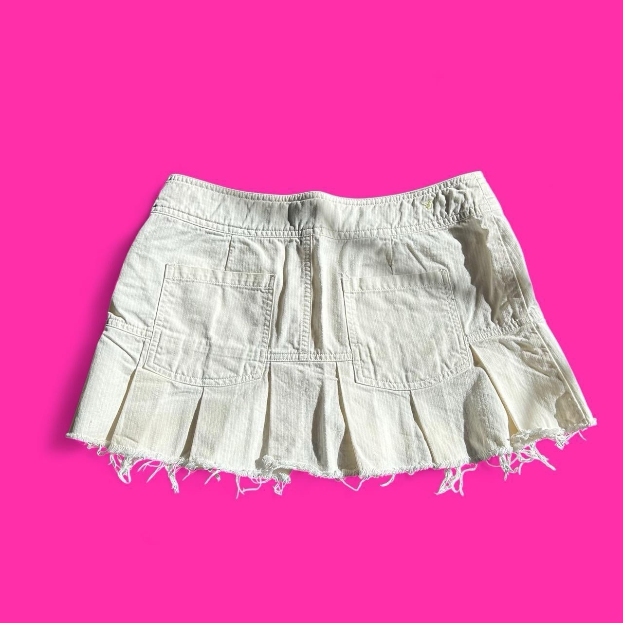 Super Cute Vintage Size 4 American Eagle White Denim Pleated ultra- mini skirt with frayed hem and side button detail #y2kfashion #Y2K #miniskirt #denim #preppy