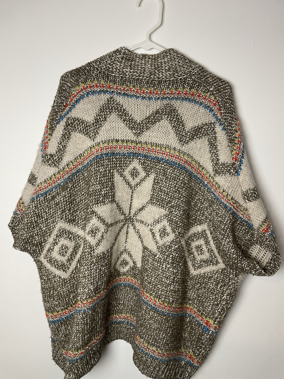 Wrap yourself in the cozy comfort of this American Eagle Wool Alpaca Cardigan, a versatile addition to any wardrobe. The chunky-knit sweater features a vibrant, multicolored geometric pattern with a relaxed fit that's perfect for laid-back occasions. Long dolman sleeves and a flattering V-neck design provide both style and warmth, making it an ideal choice for any season. Crafted from a soft blend of alpaca, wool, and acrylic, this machine-washable cardigan ensures easy care and long-lasting wear. Accented with buttons, it brings a touch of bohemian charm to your ensemble. Whether you're out for a casual meet-up or just enjoying a cozy day at home, this oversized sweater is sure to become a cherished staple in your collection.