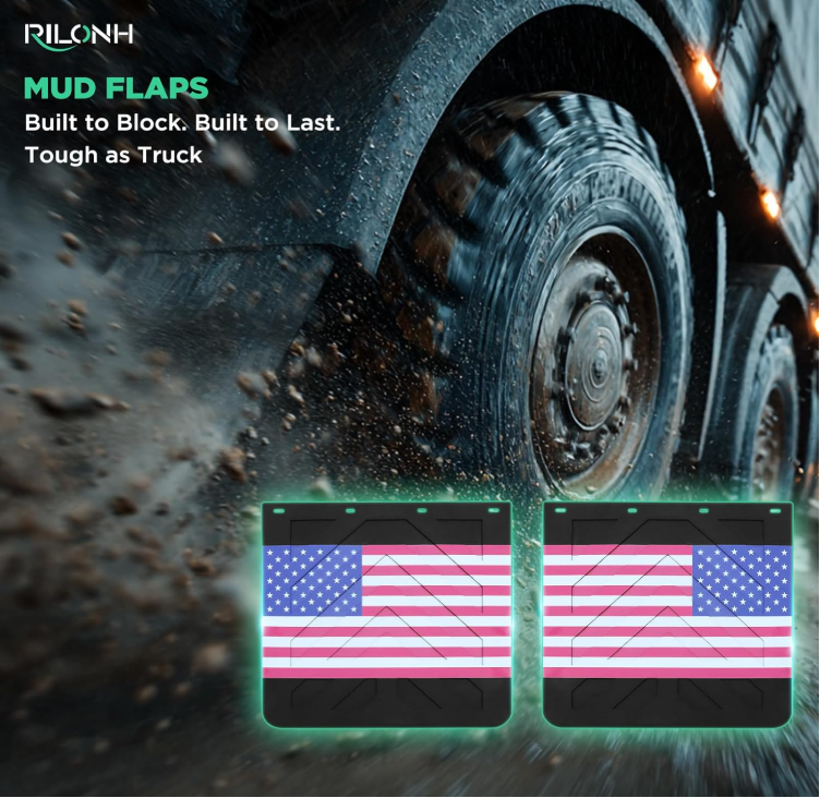 American Flag Mud Flaps for Semi Trucks Tractor Trailer Heavy Duty PVC Polymer Rubber Mudflaps Oversized Splash Guard, 24 x 30Inch, 2PCS Description: Size: Length * Width:24" x 30"; Made from 1/5 inch thick heavy-duty polymer for durability in severe road conditions. Design:The mud flaps feature a micro-groove pattern design, facilitating the swift diversion of rainwater and debris to prevent accumulation and splashing. Durability: Made from a robust combination of high-quality plastic and rubber, our mud flaps resist breaking, deformation, and curling. Unaffected by extreme temperatures, ensuring they won't easily deform in either scorching heat or freezing cold. Mud flaps feature a custom flag design, providing a distinctive and unique pattern to add a personalized touch to your truck. Friendly Reminder: Avoid using a high-pressure water gun to clean the fenders with patterns, as this may cause them to detach. RILONH Warranty and Customer Support: Enjoy peace of mind with our one-year warranty.