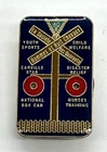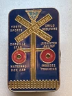 American Legion 40/8 Light-up flashing yellow lights, Railroad Crossing Box Car Lapel Hat Pin WORKS! RARE Pre-Owned, Pristine Condition. New Batteries. WORKS! See Photos & Video Rectangle with gold/brown railroad crossing sign with flashing lights. New batteries size AG3 (takes 2) includedGold tone words: Youth Sports, Child Welfare, Carville Star, Disaster Relief, National Box Car, Nurses Training Historical significance of 40/8. RARE PIN.