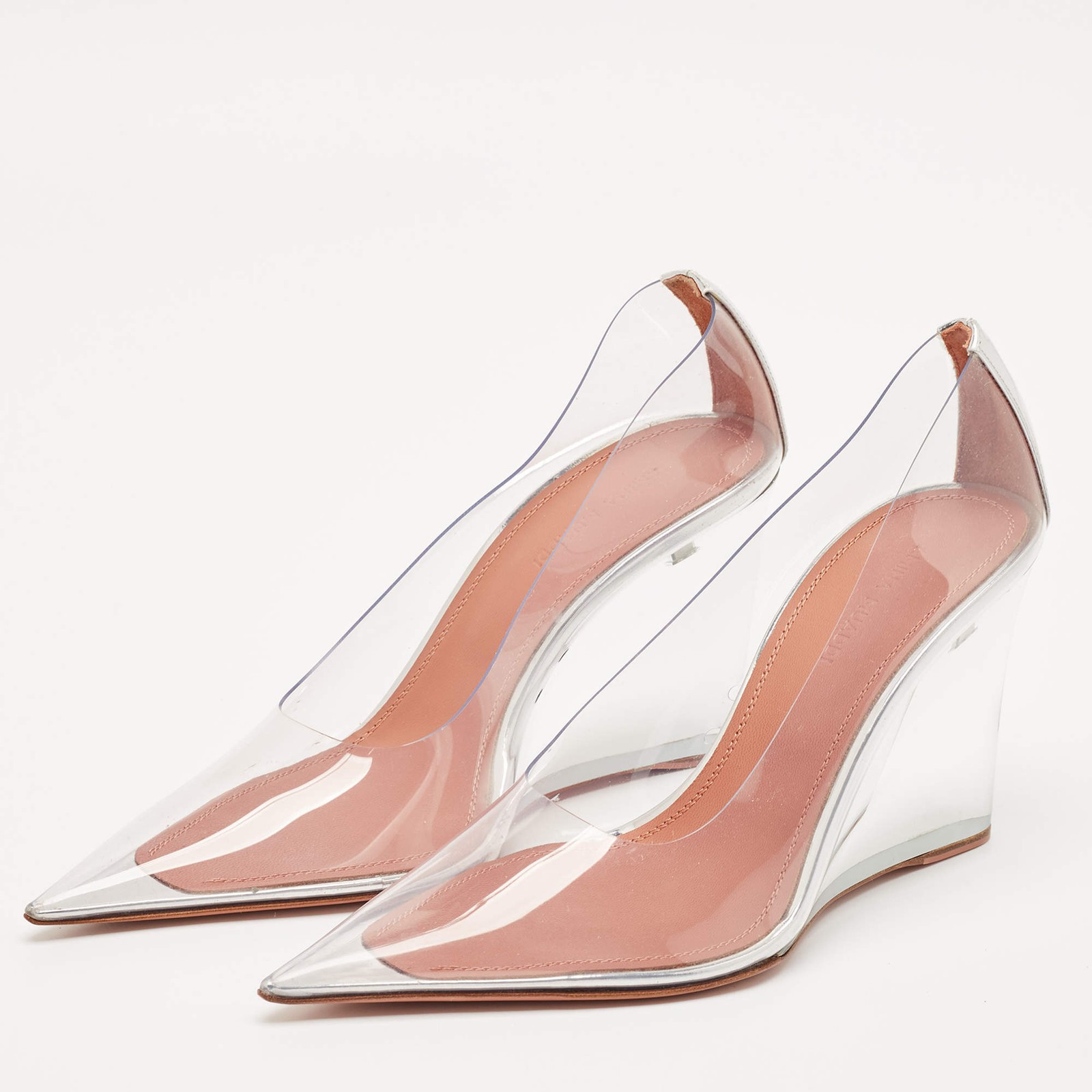 Our eBay Store About Us Contact Us Add to Favorite Sellers Amina Muaddi Transparent PVC Ane Wedge Pumps Size 37 Step into sophistication with these stunning wedge pumps, combining leather's elegance with modern PVC's allure. Crafted in Italy, these shoes' transparent design offers a chic and unique twist, letting your style shine through effortlessly. Product Details Brand Amina Muaddi Color Transparent Includes Original Box Outsole Length 25 cm Outsole Width 8 cm Size 37 Certified by The Luxury Closet This item has gone through a detailed authentication process overseen by our experts. We offer a lifetime guarantee of authenticity on all our items. How We Check The in-house team of experts at The Luxury Closet is highly trained to verify the authenticity and the condition of the luxury products. They ensure that only 100% authentic items are put on sale.The evaluation process is unique with its own mix of assessment criteria and differs according to the category. Each item is evaluated based on the following combination of hallmarks, hardware, stitching, symmetry, material, craftsmanship, stamping, codes, hologram stickers, and packaging. Our authenticators also check if the items have been modified or amended (e.g., aftermarket diamonds, replaced batteries, repaired bags, etc.) International Buyers Import duties, taxes and charges are not included in the item price. These charges are the buyers responsibility. Please check with your country’s customs office to determine what these additional cost will be prior to buying.