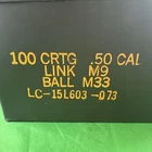 The Ammo Can is a 50 Cal metal box with inside dimensions of 11"L x 5 1/2"W x 7"H. It is in OD Green color and features a Militaria theme. Manufactured by a U.S. Government Contractor, this Ammo Can is designed for 100 CRTG M33 Link M9 50CAL ammunition. It has outside dimensions of 11 1/2"L x 6 1/8"W x 7 1/4"H.
