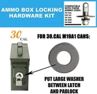 Package Include: Only Lock Set(No Box) Instructions: Close the lid and lat ch of the ammo can and mark the center of the hole where the locking hardware will be installed (try to be exact!) Drill a 5/16”hole into the can at the center mark (drilling out a smaller guide hole beforehand may be helpful) Form the outside of the can,insert the locking stud through the drill hole On the inside of the can,put the neoprene washer over the threads of the locking stud,followed by the small washer,and then the nylon lock nut.Tighten the assembly with a wrench,being aware that the “round” side of the locking stud may have sharp edges/burs,so a tool should be utilized on”round”side,not bare hands For ammo cans with large holes,put the large washer between the ammo can’s latch and the padlock in order to prevent the large latch hole from slipping over the padlock If you finshin the assembly and find the locking stud is not centered,simply file or drill the ammo can’s latch holes to be larger until the latches properly fit the locking stud You get the lock hardware kit; you DO NOT GET the Ammo can and padlock Close the lid and latch of the ammo can and mark the center of the hole where the locking hardware will be installed (try to be exact!) Drill a 5/16”hole into the can at the center mark (drilling out a smaller guide hole beforehand may be helpful) Notice: 50cal can ammo hole dimension is 1/2", you need to enlarge it,otherwise the lock hardware kit cannot be passed through.