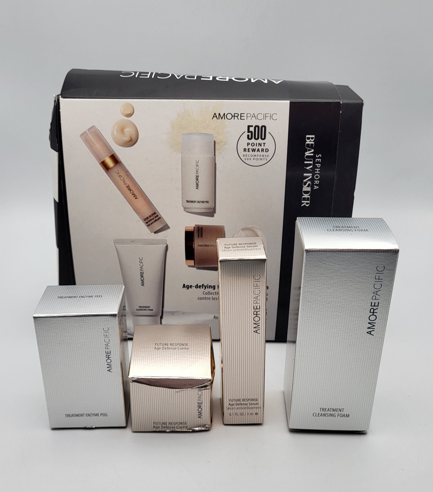 Amore Pacific Age Defying Skincare Collection. This set is brand new and unused. The box does have some wear like a tear as seen in the photos. Set Includes: • Future Response Age Defense Creme 0.27 fl oz / 8ml • Future Response Age Defense Serum 0.1 fl oz / 3ml • Treatment Cleansing Foam 1.0 fl oz / 30ml • Treatment Enzyme Peel 0.2 fl oz / 7g