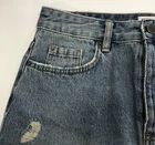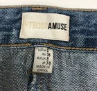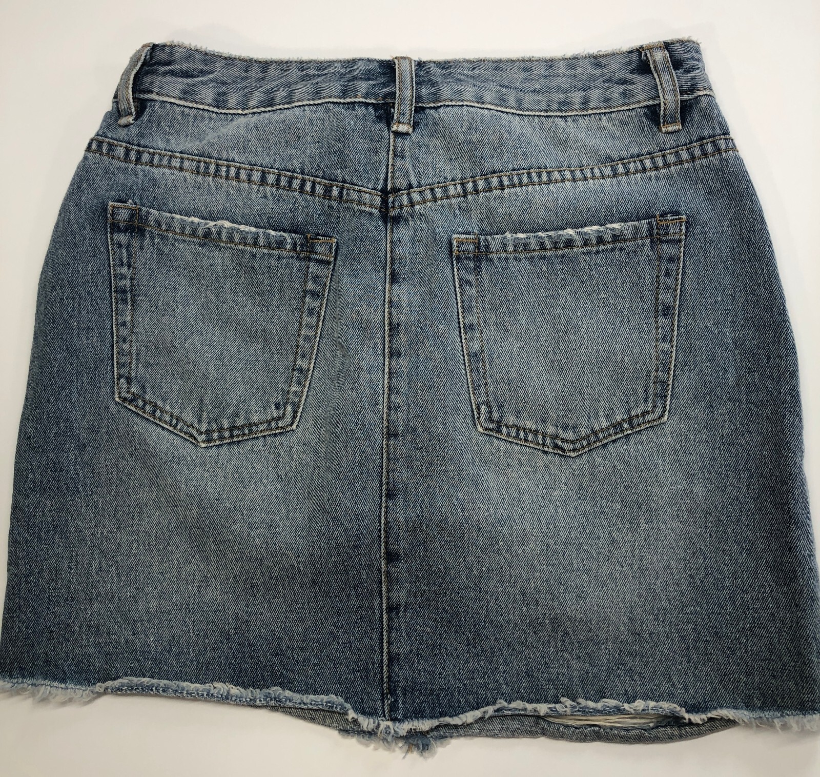 Amuse Society Blue Denim Mini Skirt Sz S Distressed Button Fly Med Wash EUC Womens blue denim mini skirt by Amuse Society. Button fly, 5-pockets, factory distressed, medium wash. Made from 100% cotton denim fabric. Easy care; machine washable. Very good pre-owned condition. Measurements below. Waist 29" Hips 38" Length 15" BnE206