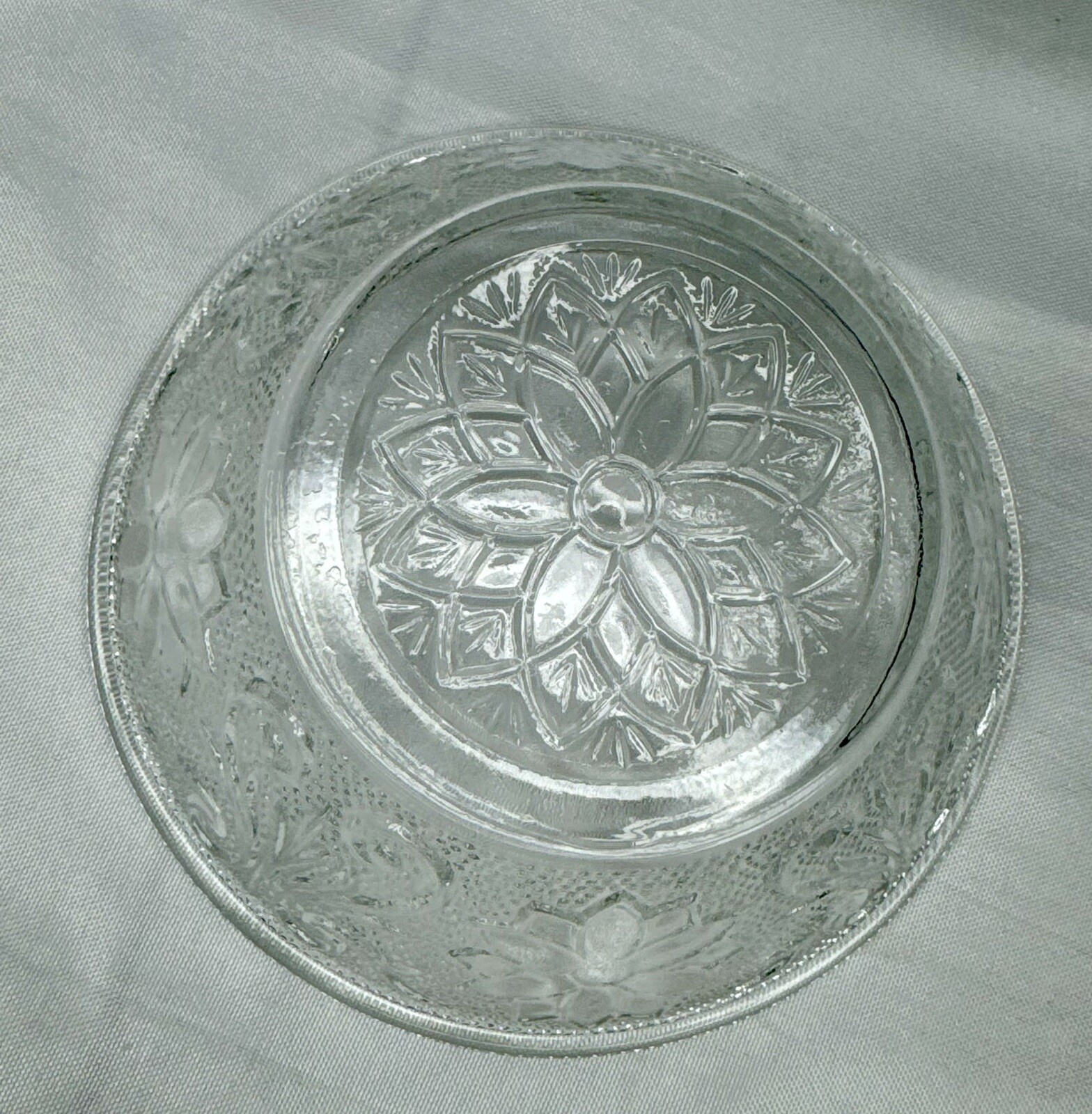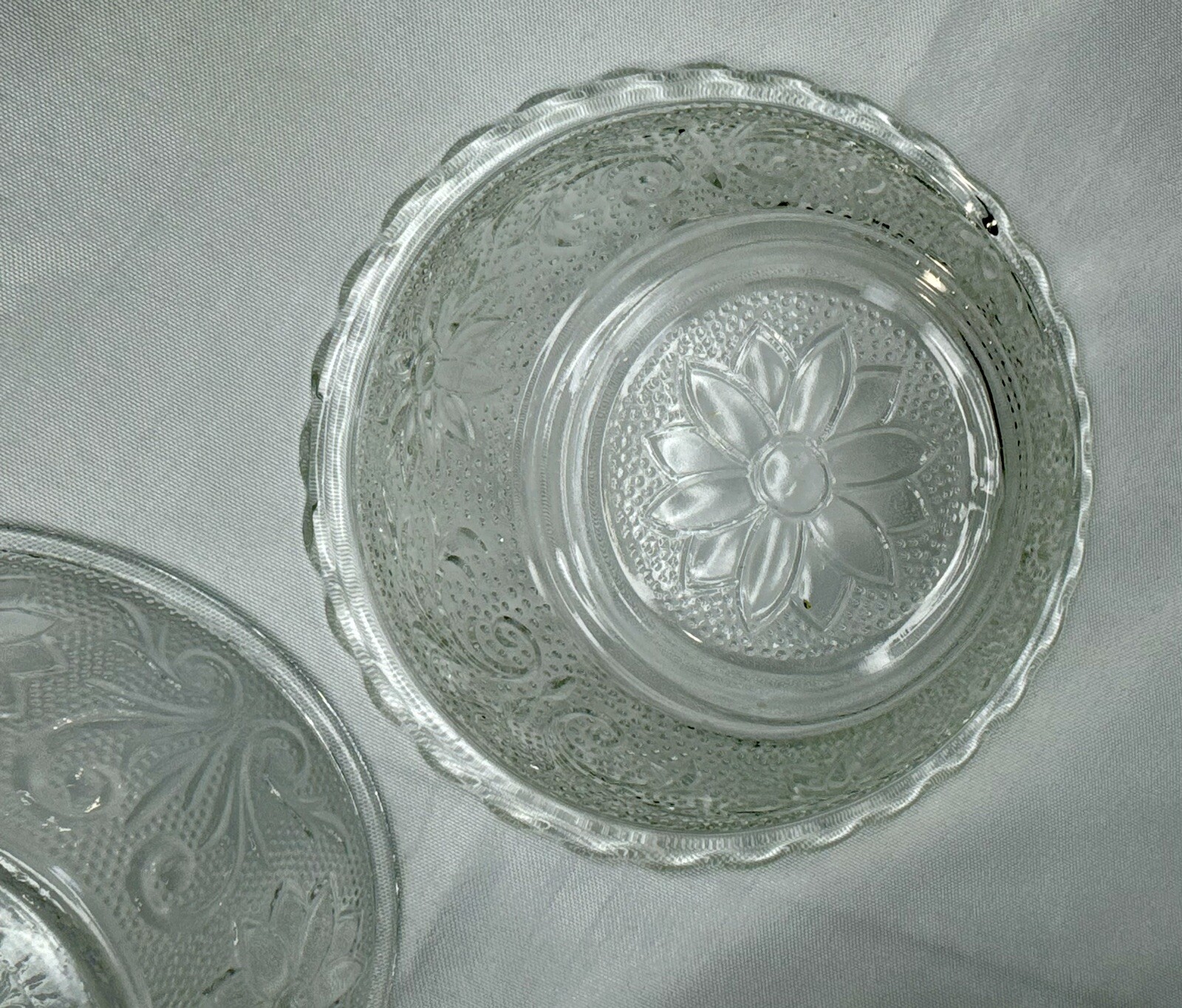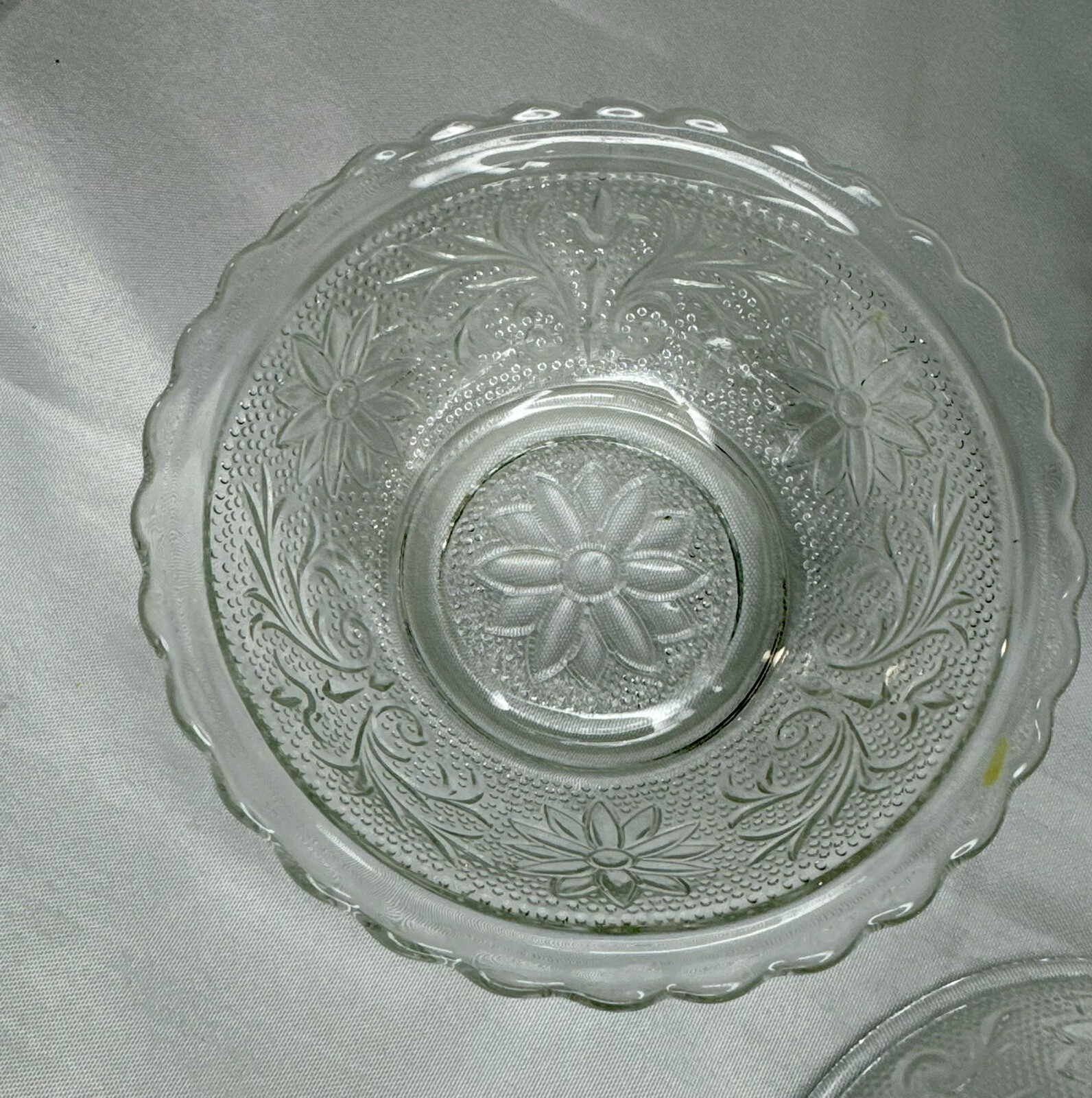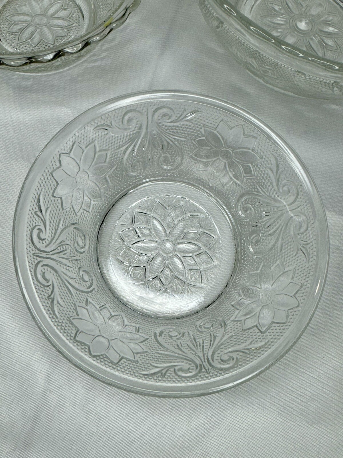 Anchor Hocking Clear Glass Candy Dish, Scalloped Edge, Flowers Bowl Set Of 3 bowls, see photos for details Pre owned in very good condition No cracks or chips Colors may appear different depending on screen or monitor viewed on.