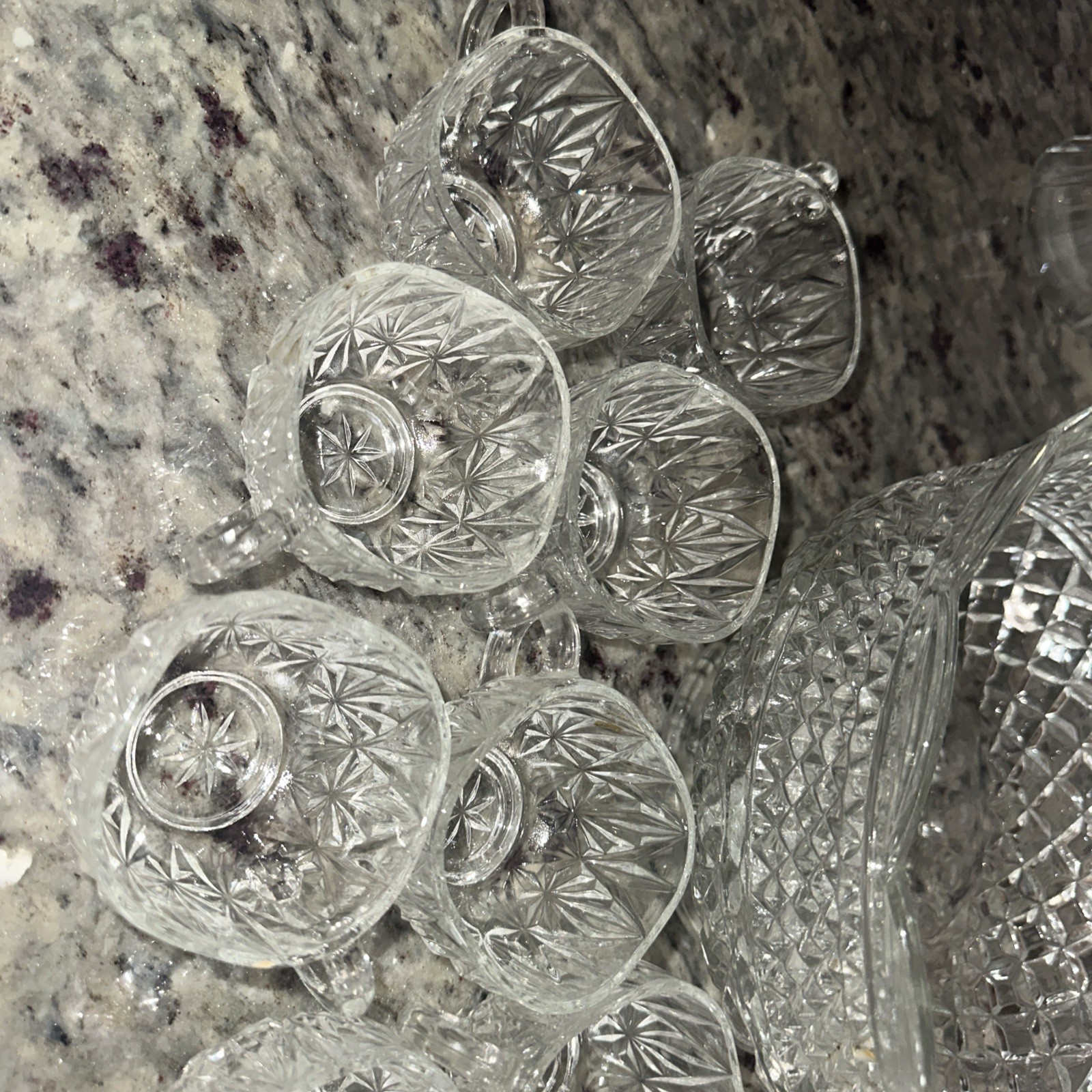 The Anchor Hocking Wexford 10" Large punch bowl set is a vintage piece made in the United States between 1962-1998. This set includes a round, clear glass punch bowl with a diameter of 10 inches and a height of 5 1/2 inches. The Wexford pattern, along with the pressed glass production style, adds a touch of elegance to any dining table or special occasion. This timeless set is perfect for serving punch in style and adding a touch of vintage charm to your home.