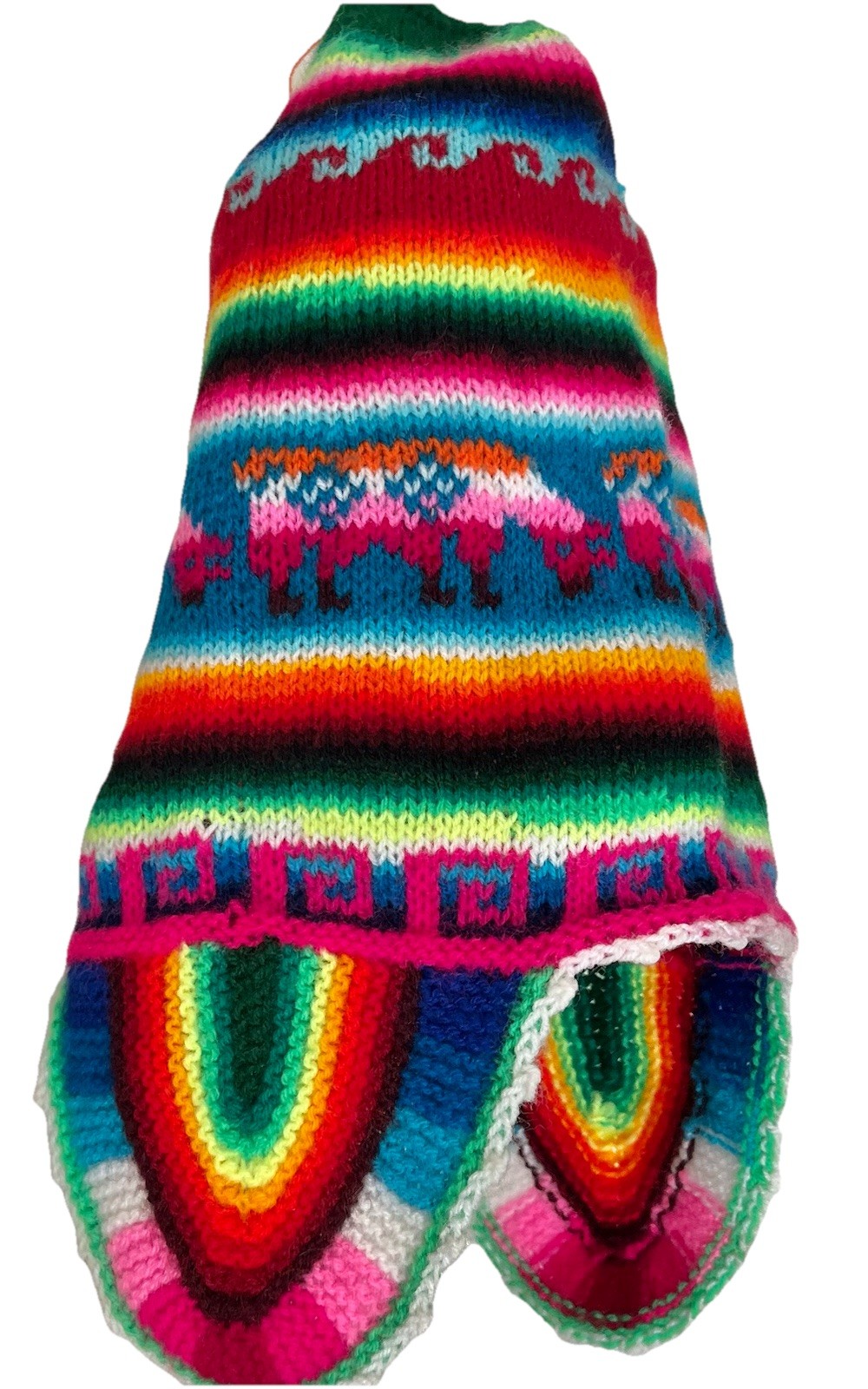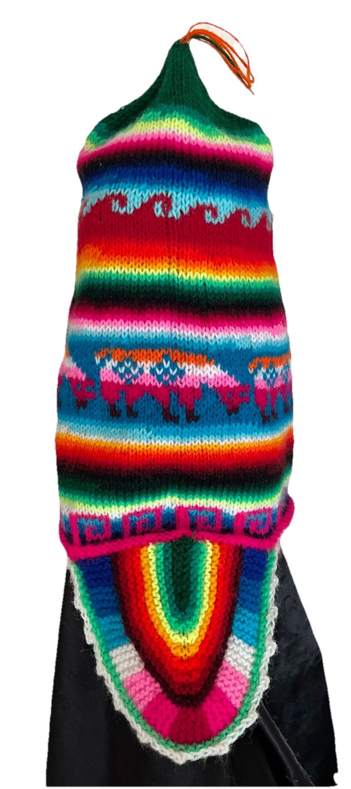 The Andes Knit Hat is a traditional Andean chullo hat designed for men or women with bright colors and ear flap covers for added style and warmth. This unisex hat is 9 inches across and 15.5 inches long, making it a versatile accessory for anyone looking to add a touch of Latin American culture to their outfit. The chullo style hat is perfect for those seeking a unique and authentic piece of world clothing. It will stretch a little to fit, regular size. Eye catching, frames face and is warm!