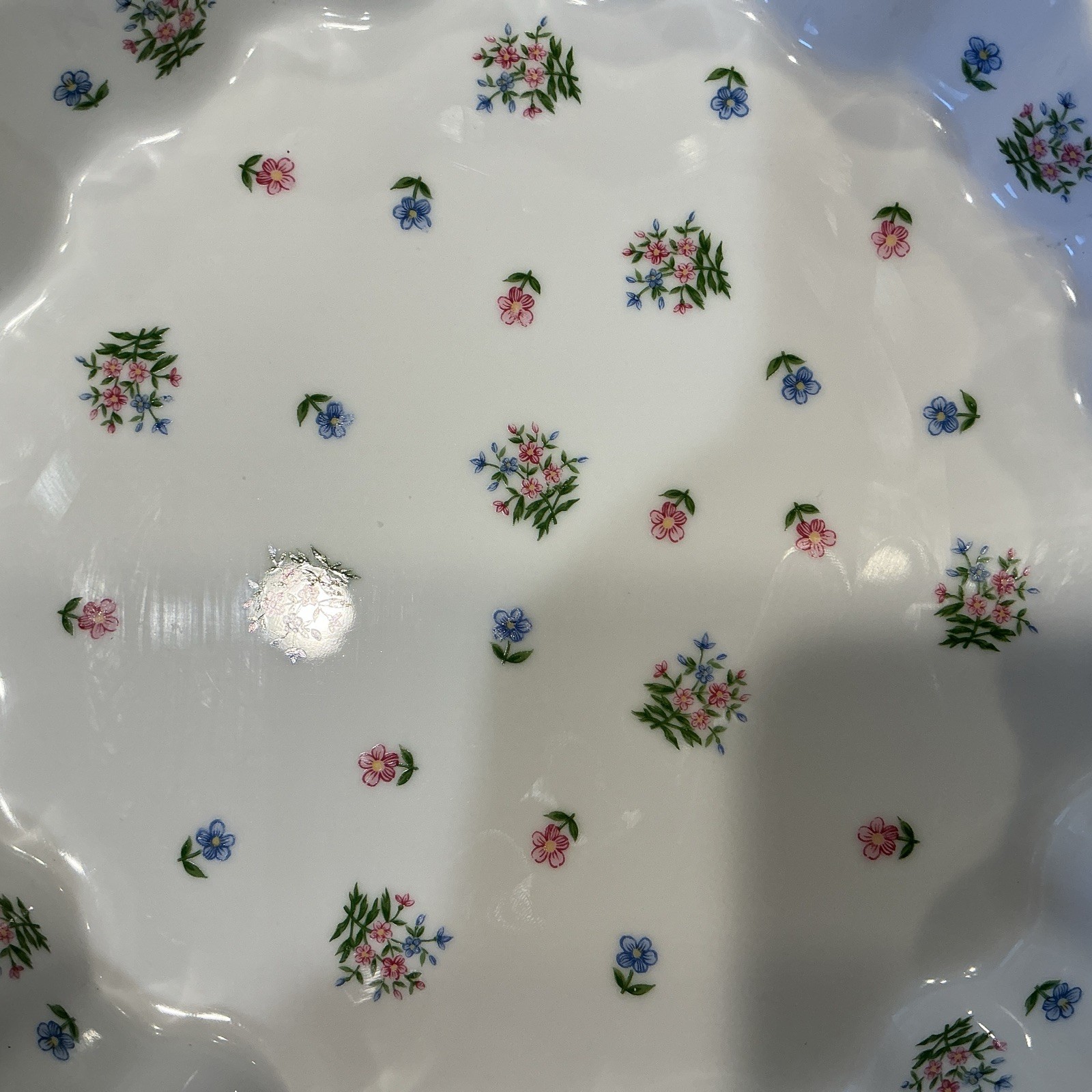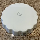 The product is a vintage 10-inch quiche tart pan, 1.5 inches deep from Andrea Cookware, featuring a floral shape and a white ceramic surface coating with petite flowers. Made in Japan in the 1970s, this is an oven-to-table item. With a classic design and original manufacturing, this petite fleur quiche tart pan is perfect for creating delicious pies and tarts for any meal. This is in EXCELLENT condition, no cracks or chips. Lovely entertaining dish. So pretty!!! **Heavy piece, shipping slightly higher.