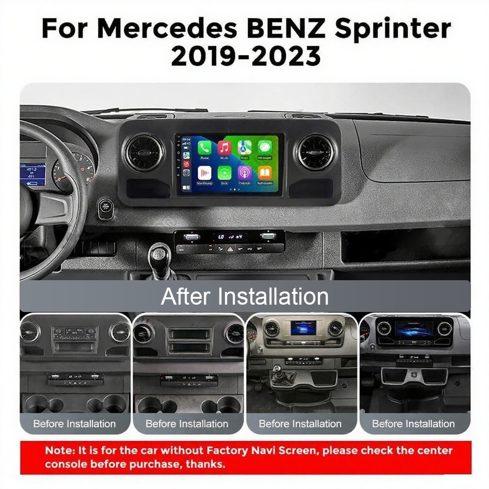 Items Description 2+32GB Android 14 Apple CarPl ay For Mercedes-Benz Sprinter 2018-2023 Features: 9 Inch Android 14 Car Radio For Mercedes-Benz Sprinter 2018-2023 : The Android car radio with 9" 1280* 720 HD capacitive touchscreen, 2GB RAM and 32GB ROM allows you to download your favorite apps and videos, so driving is no longer boring. No extra frame, no cable change, plug and play. Navigation System & WiFi : Support WiFi connection. After connecting the WiFi, you can download any APP from App Store, e.g. B. Youtube, Tik Tok, Spotify, etc. Car stereo with GPS, accurate positioning, stable signal, support using online or offline maps, no longer worry about getting lost when you are driving. Independent antenna ensures strong WiFi reception. RDS/FM Radio & Bluetooth & ASP Sound : Supports Bluetooth 4.1, with built-in microphone so you can make hands-free calls while driving. Support access to phone book, music playback interface, etc. RDS supported. You can save 18 FM radio stations. Built-in ASP chip. Supports 32-band EQ setting, which can be adjusted according to your personal preference. Which is very similar to your original sound. 4 x 45W amplifier, surround sound and subwoofer output MIRROR LINK: With this car radio, you can experience the amazing Mirror Link function, compatible with iOS and Android phones. You can mirror your smartphone screen to the car radio using apps like Google Maps, Spotify, Youtube, etc. Replace your cell phone with the car screen and turn your vehicle into a smart platform. Rear View Camera Input & Steering Wheel Control : After connecting to the rear view camera. The radio automatically displays the reversing image as soon as you engage reverse gear. Make your daily reversing safer. Support Rear View HD camera. Support original car steering wheel control to make driving more convenient and safer. NOT Inc luded Reverse Camera Specificaiton: System: Android 14 Screen: 9 Inch 1280x720 HD capacitive touch screen, large Viewing angle CPU: 4 Core Memory: 2GB (RAM) + 32GB (ROM) Radio band: FM Radio Frequency: FM 87.5M-108M Radio Data System ( RDS ): RT, AF, TA provides all the FM channel information you need(europe). Mosfet power amplifier: 4 x 45 watts for maximum power Bluetooth: 4.1 Audio format: MP3, FLAC, APE, WMA, WAV, AAC, AMR