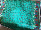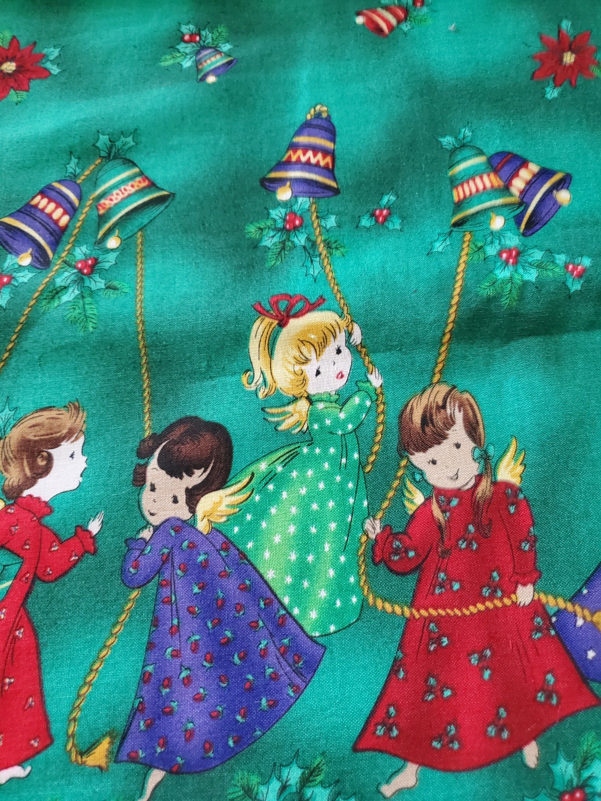 The product is an 84x56 vintage 1990's cotton fabric from Jellybean Junction, licensed to Peter Pan Fabrics, featuring a green color and red green and blue dancing angels as borderline print with green coordinating bells and poinsettias print . Designed as "Angel Belles Are Ringing." This medium-weight fabric is suitable for quilting and is made in the United States. It is not handmade, making it a convenient and versatile option for crafters and sewing enthusiasts looking to add a unique and nostalgic touch to their projects.