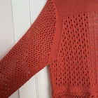 The color is more coral or salmon than orange. Size tag is missing but I suspect M/L A forgiving size anyway due to open, relaxed style. In excellent preowned condition. Measures 16” across shoulder 34” long 20” sleeve