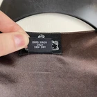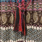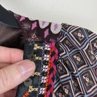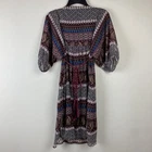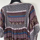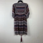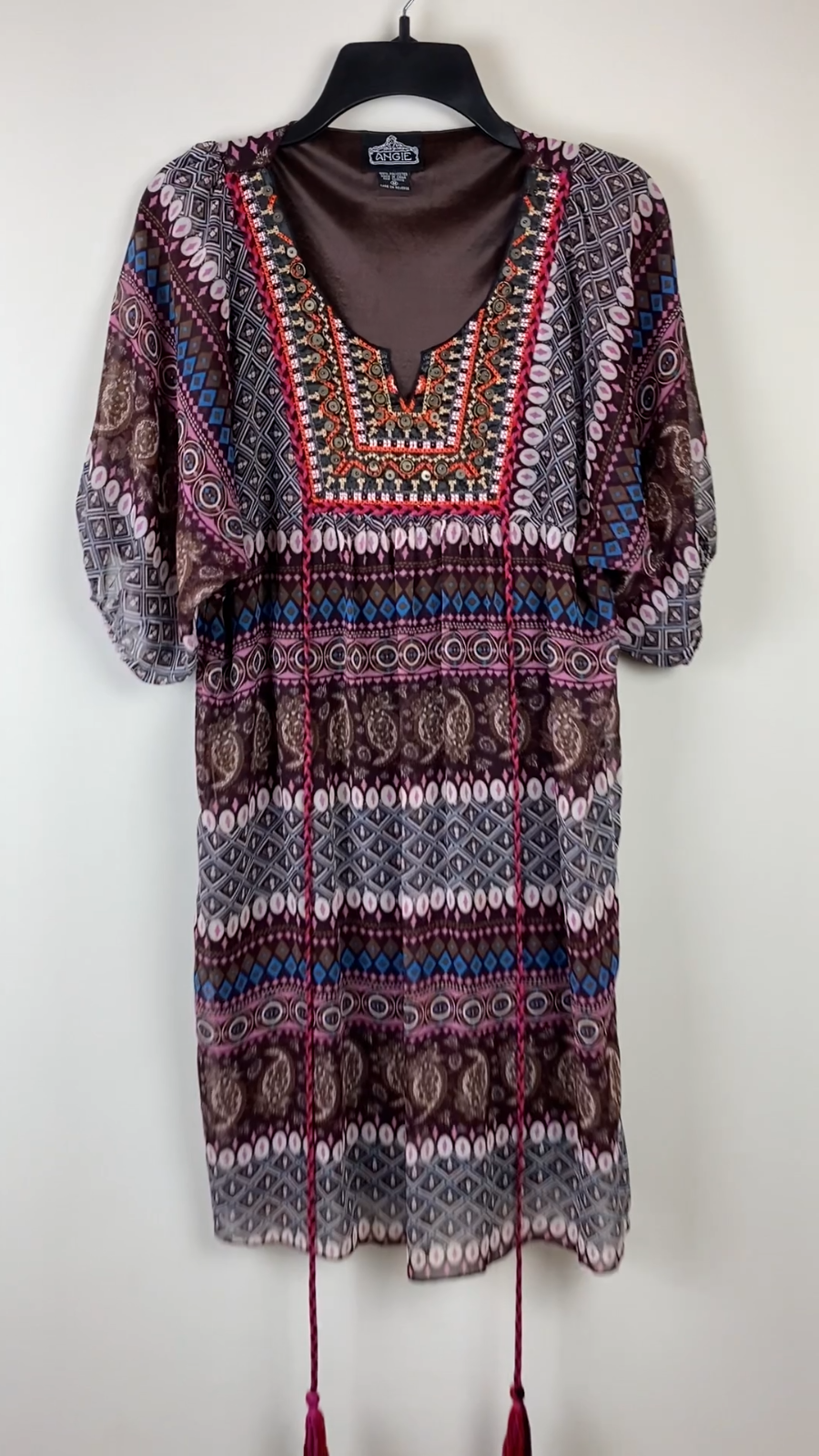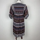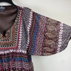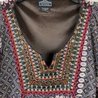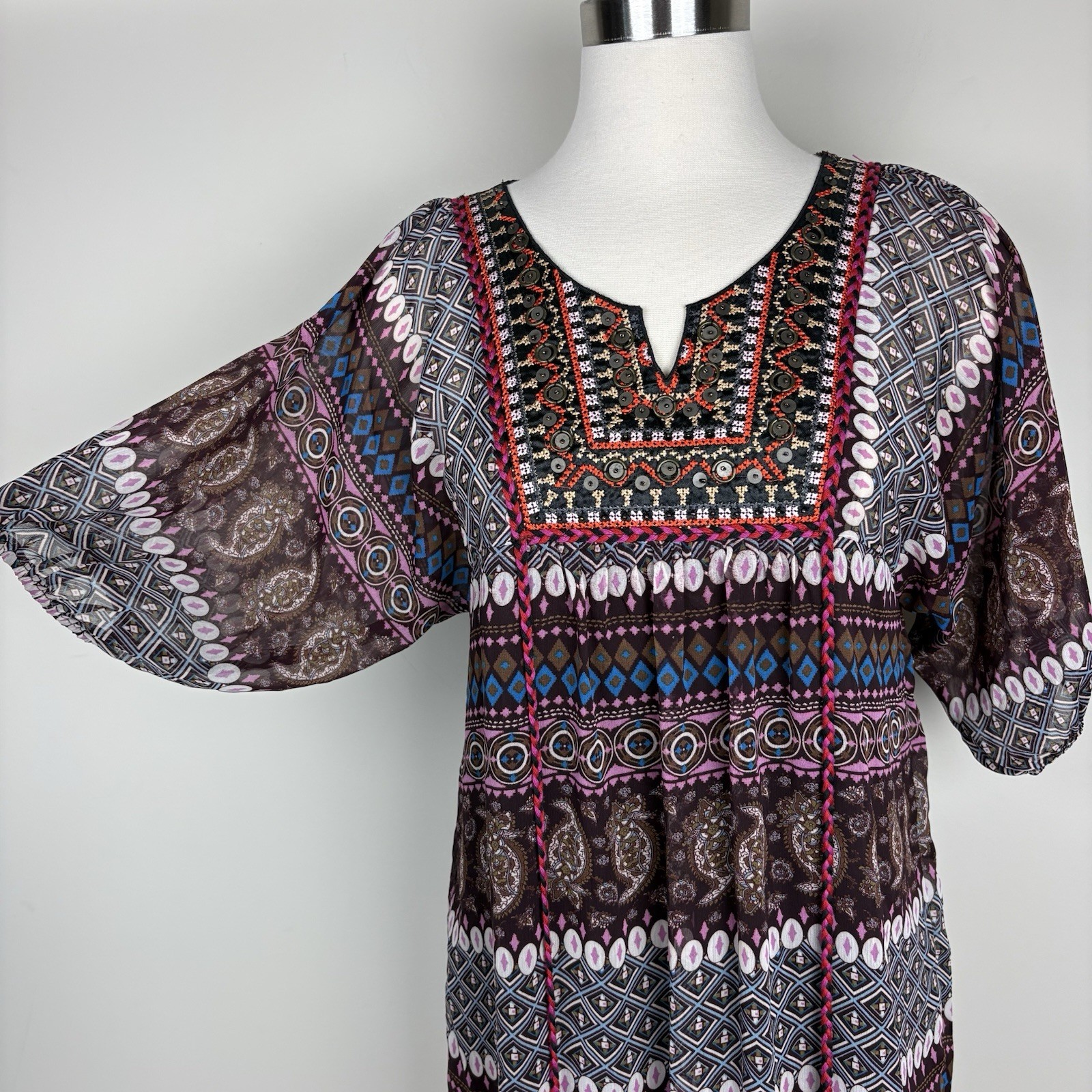 Bohemian short dress or tunic top, sheer fabric in brown, pink, teal, cream, tan, and orange geometric designs with brown lining. Metal detailing and embroidery on front yoke. Braided tie in front in pink, red and black with tassel ends, split neckline. Tassels can be tied in front or back. Puffed sheer sleeves, elbow length, elasticized. Back of top is gathered to add a full, flowy effect. SIZE: Medium COLOR: brown, pink, teal, cream, tan, and orange FABRIC CONTENT: 100% polyester STYLE: Short Dress or Tunic CARE: Hand wash CONDITION: Very good pre-owned condition with no fading, stains, or tears. There is one spot on the wearer's right chest near the bottom of the embroidery where it looks like one of the threads has been pulled (see last photo), and there is one little sewn on disc near wearer's left shoulder that is a bit loose (see 2nd to last photo). Please see photos for details. FLAT MEASUREMENTS (approximate) Underarm to Underarm: 17" Shoulder to Hem: 34" Sleeve Length: 15" from neck If you have any questions, please don’t hesitate to ask. Thanks for viewing our listing! Lightweight, hippie vibe, mixed media details, boho, tribal, embellished