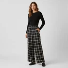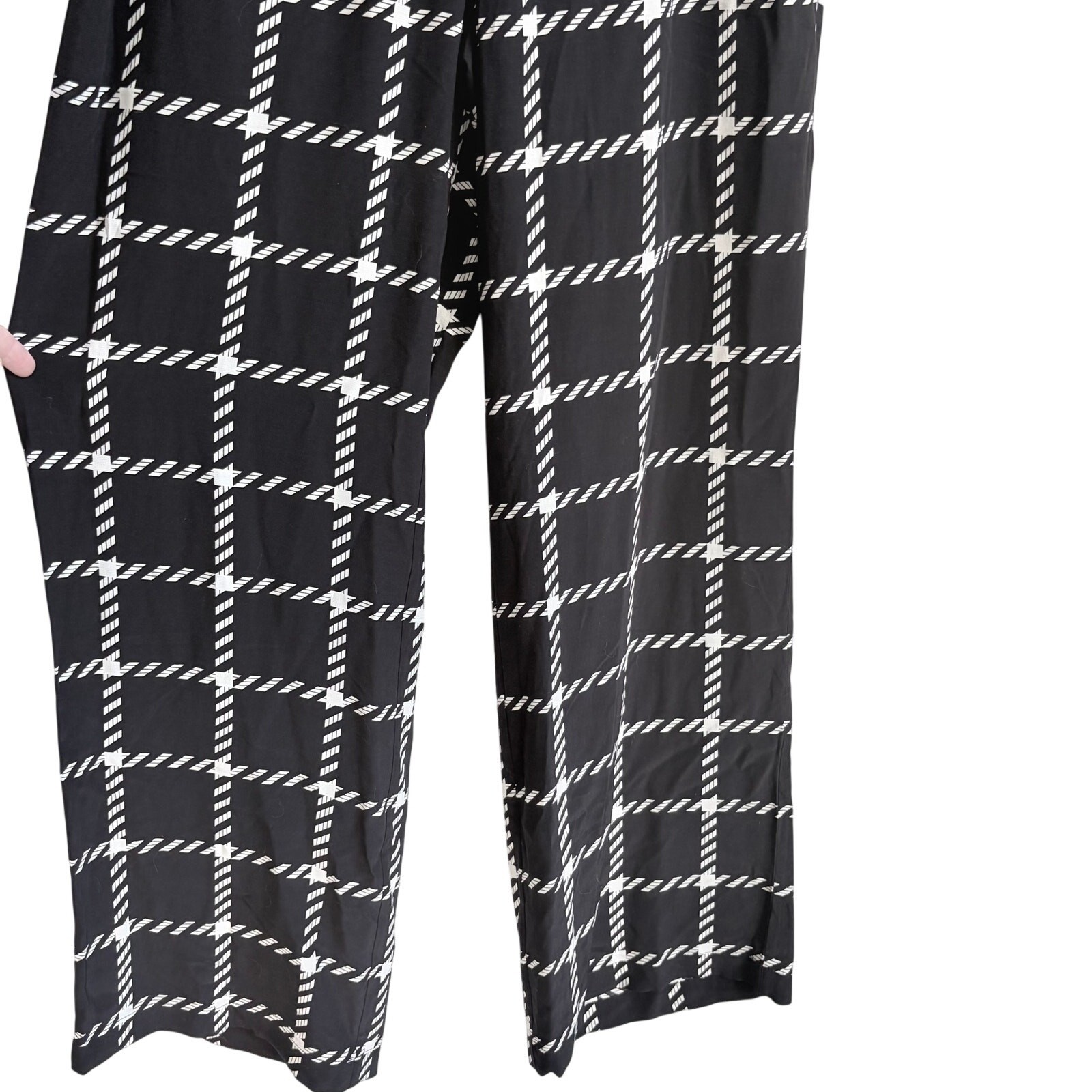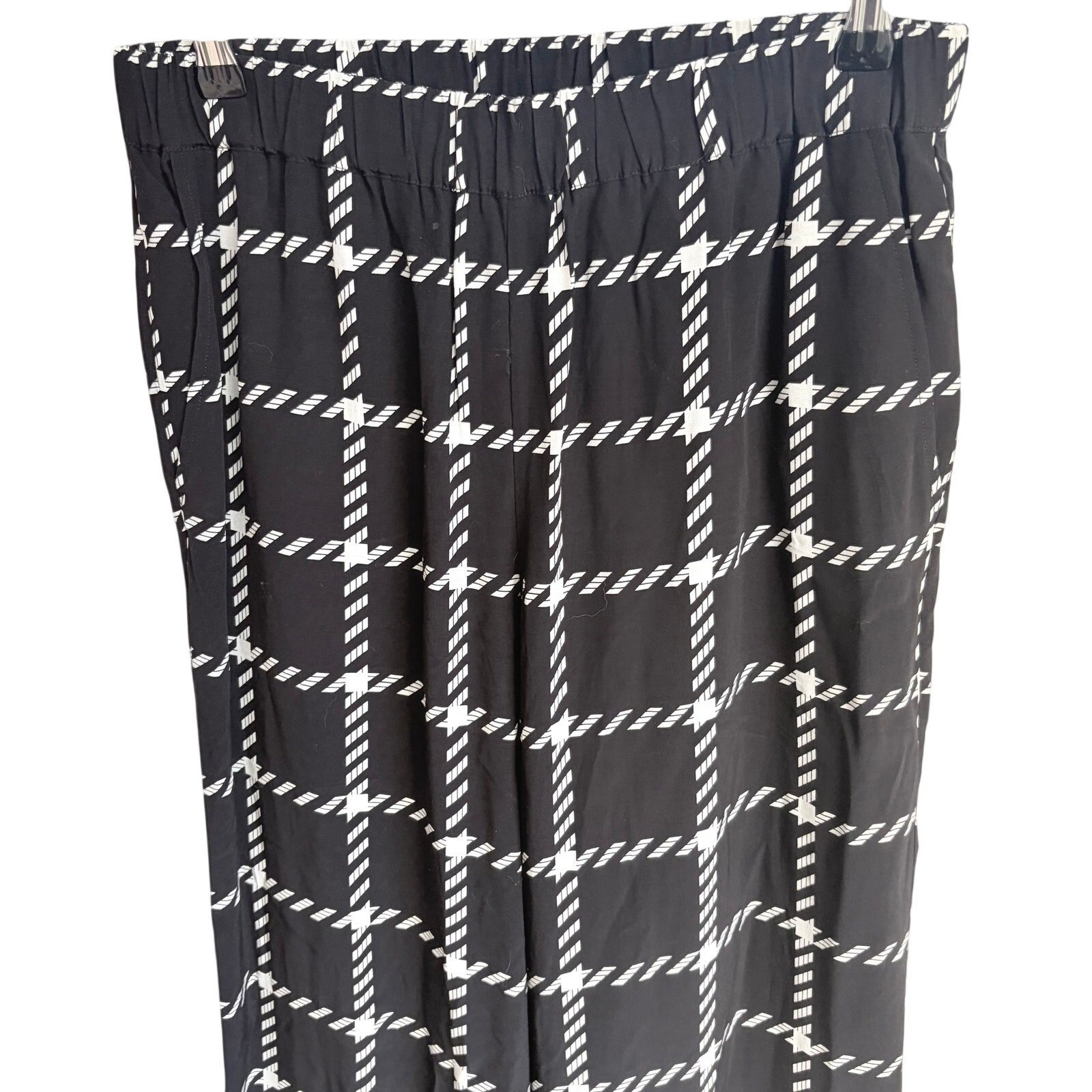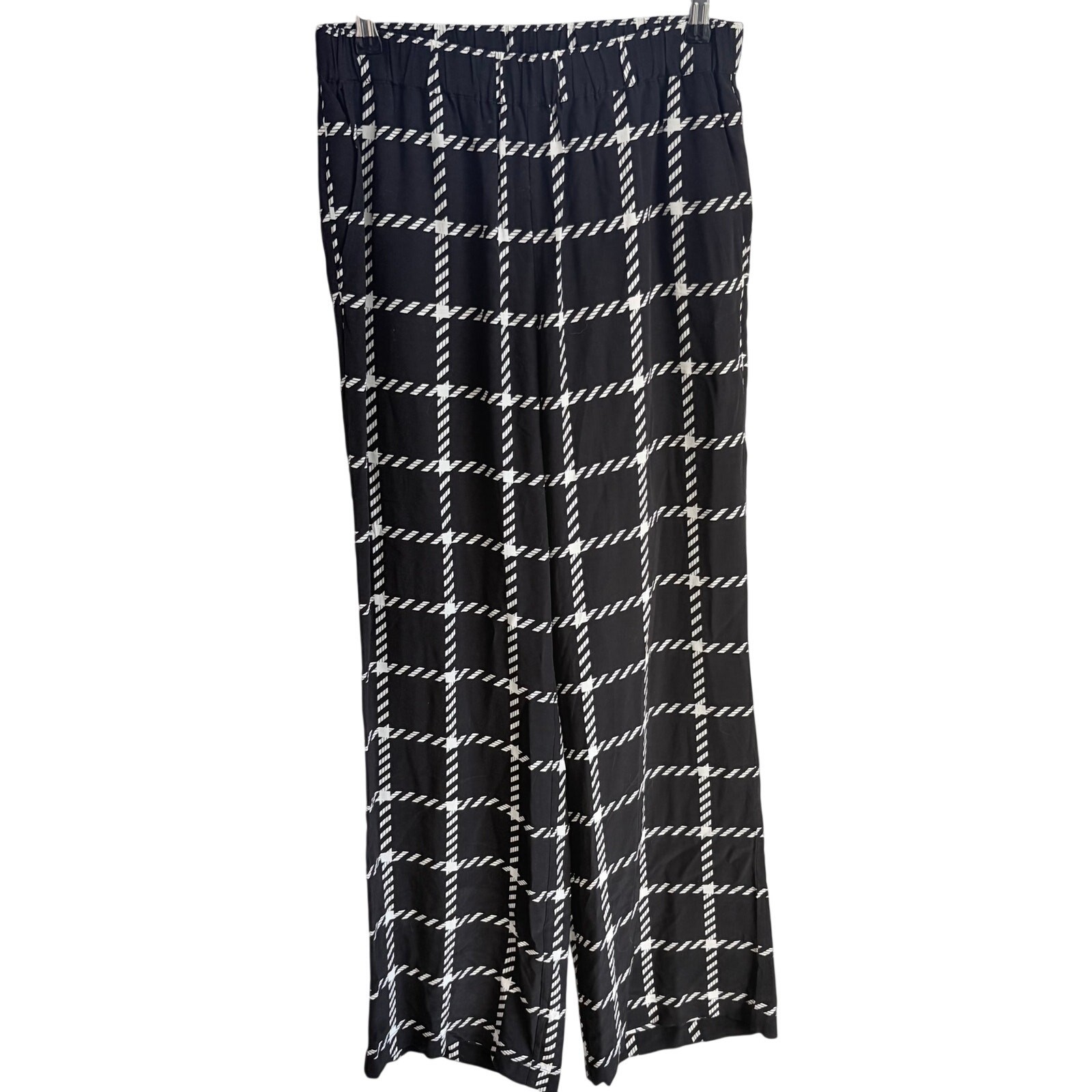 The Owen Pant is made from a lightweight viscose-rayon blend in a windowpane plaid pattern. It features an elasticated waistband, functional slant pockets at each side seam, and a relaxed, pajama-inspired silhouette. The Owen Pant is cut for a relaxed, pajama-inspired fit with a wide leg and full-length inseam. Take your true size. Details: • Size: Medium • Color: Black with white grid print • Material: Lightweight woven fabric • Style: Wide-leg pull-on pant • Waistband: Elastic • Features: Side pockets, diagonal check pattern • Condition: Excellent Waist flat - 14.75" Rise - 12" Inseam - 30" Note that the model photos are AI and are used to show fit and style Anine Bing pants, wide-leg trousers, designer, luxury, pull-on style, lightweight fabric, grid print, black and white, minimalist fashion, creative office wear, casual chic, elevated basics, designer loungewear, capsule wardrobe, statement pants, size medium, travel-ready, relaxed fit, editorial edge