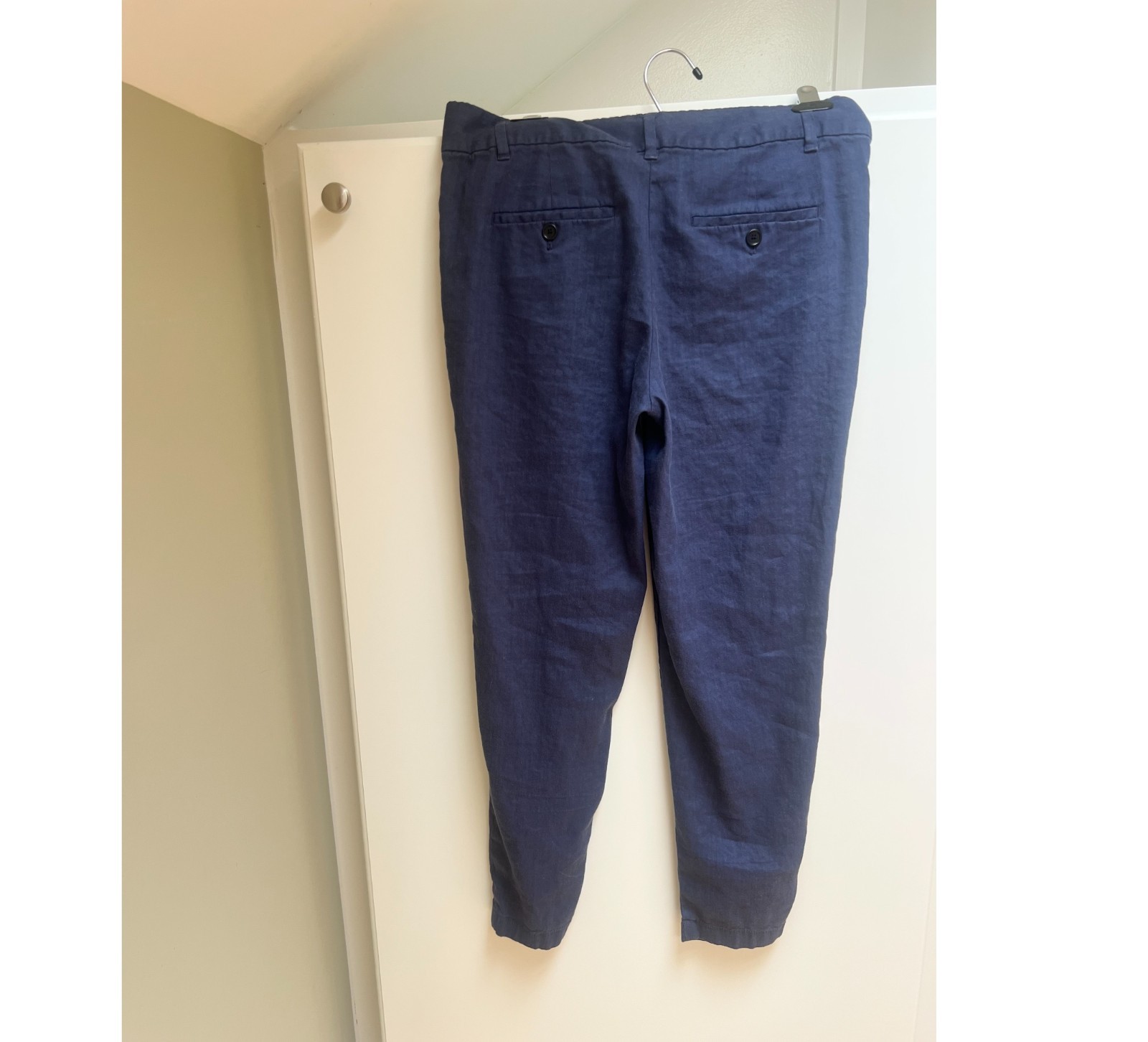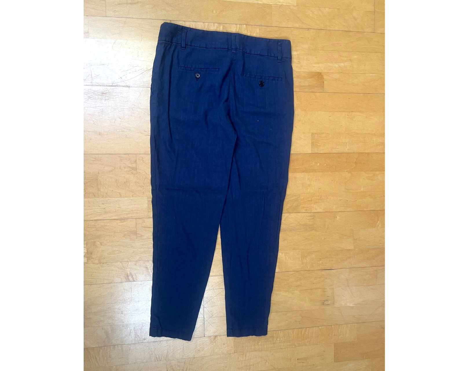 Ann Taylor Navy Blue Linen Tapered Ankle Pants Size 6 Description: Classic Ann Taylor tapered pants in versatile navy blue! Made from breathable linen, these are perfect for warm weather and work year-round. These classic tapered pants are a wardrobe essential! The tapered ankle cut is modern and flattering. Pair with a tucked-in blouse and blazer for the office, or keep it casual with a simple tee and flats. A versatile piece you'll reach for constantly! Details: Size 6 Linen blend fabric Navy blue color Mid-rise waist Front slant pockets Back welt pockets Belt loops Hook and bar closure with zip fly Tapered leg Ankle/cropped length Relaxed, comfortable fit Fully lined Dry clean recommended Measurements (see photos): Waist: 15" across Rise: 10" Inseam: 28"