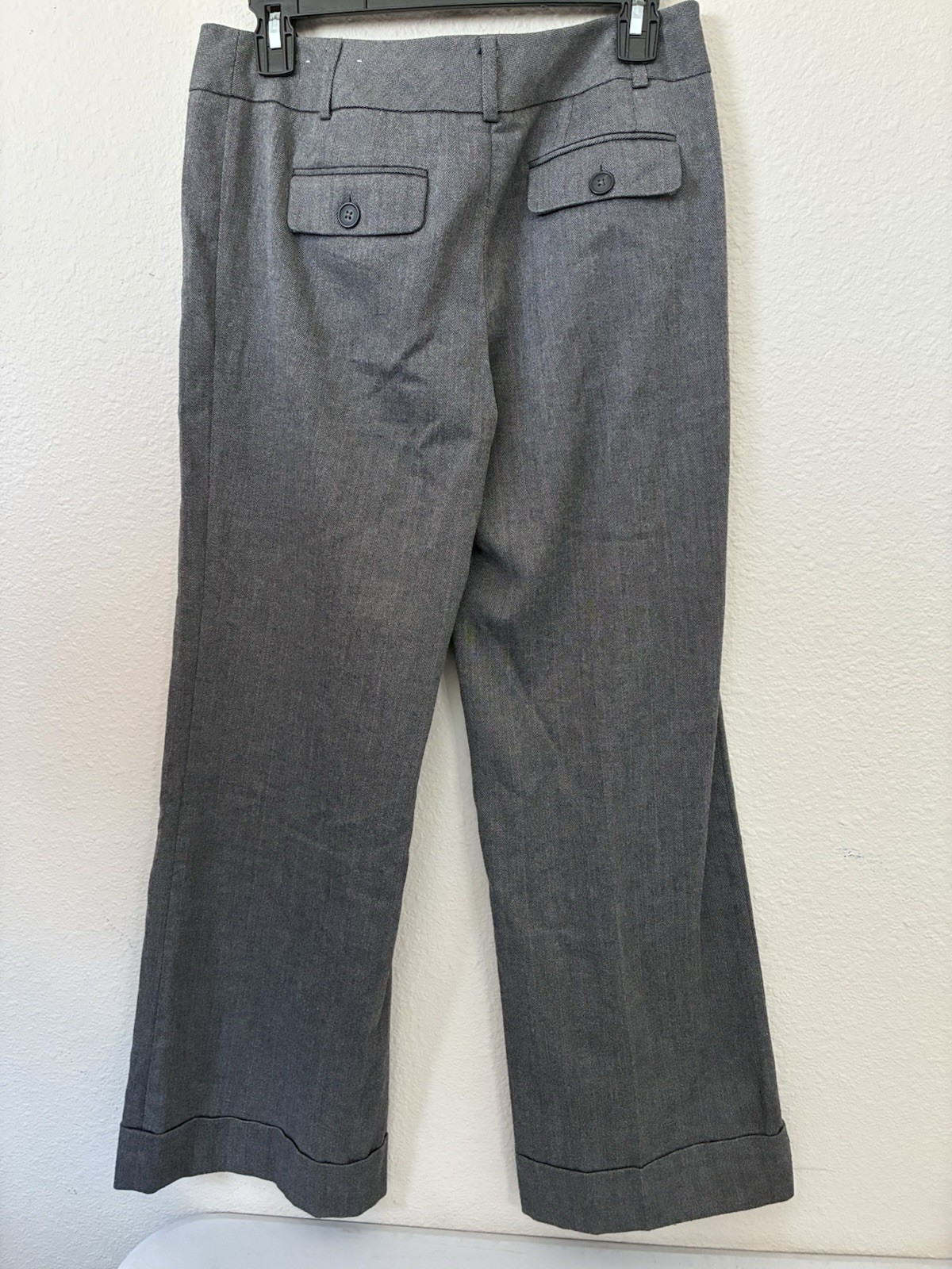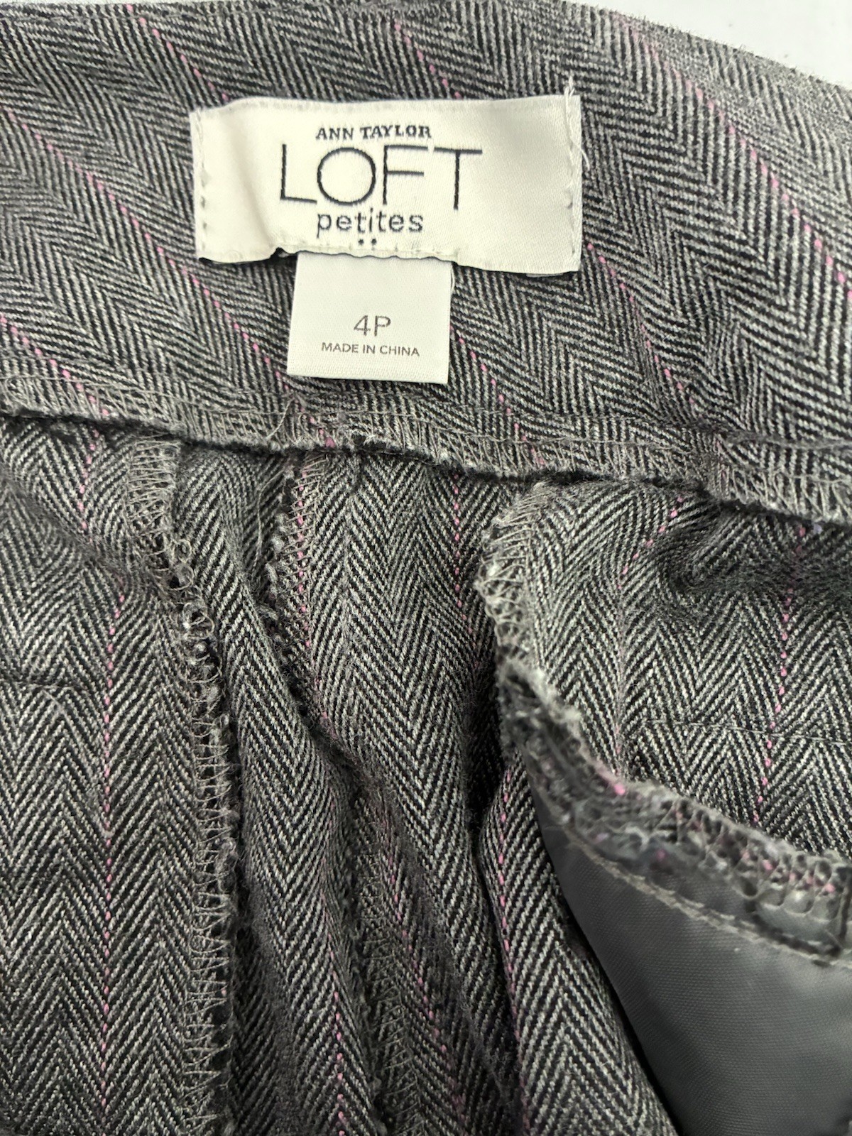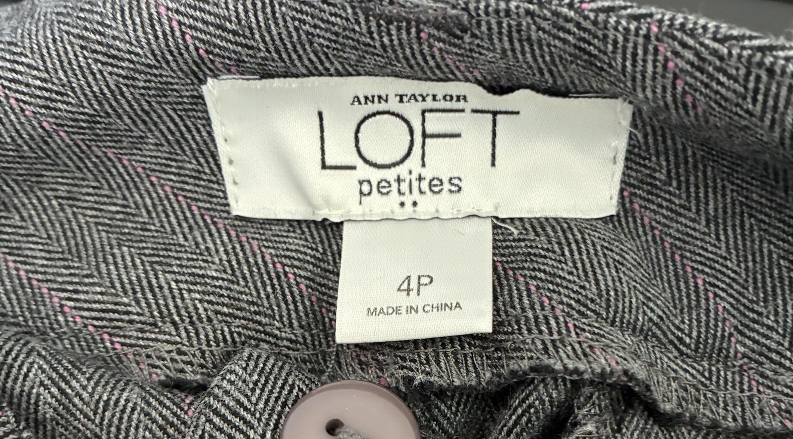 The product is a pair of Ann Taylor Loft grey dress pants in size 4P, designed specifically for petite women. These stylish pants are perfect for a professional or formal look, with their classic grey color and sleek dress pant style. Made by the reputable brand Ann Taylor, these pants are sure to be of high quality and fashionable design, making them a versatile and chic addition to any woman's wardrobe.
