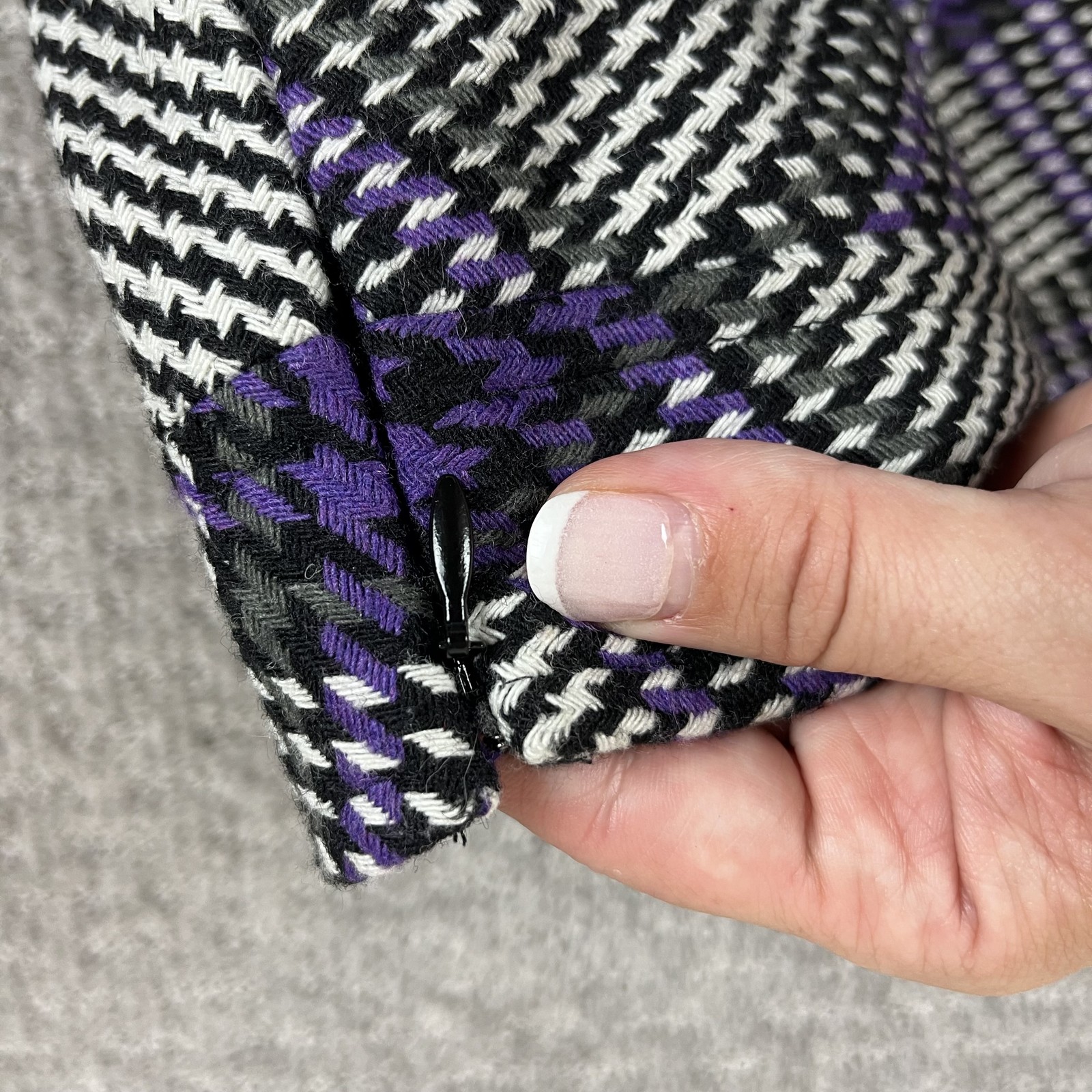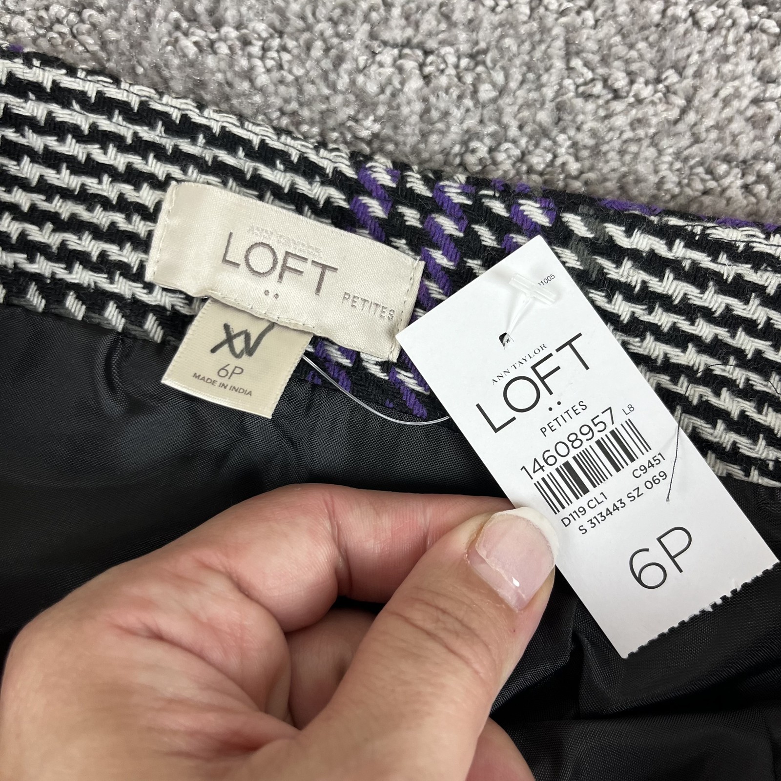 Ann Taylor Loft Skirt Womens 6 Petite Purple Black White Plaid Wool Blend Condition: Brand New with Tags -- no flaws noted Shell: 58% polyester, 22% acrylic, 12% wool, 6% rayon, 2% other fiber Lining: 100% polyester Classic purple, black, and white plaid houndstooth pattern Fully lined for comfort and structure Side zipper closure for secure fit Tag size: 6 Petite (Womens) Made in India Waist laid flat: approximately 14 inches Length: approximately 18 inches Weighs 9.6 oz Perfect for work, office, or casual wear