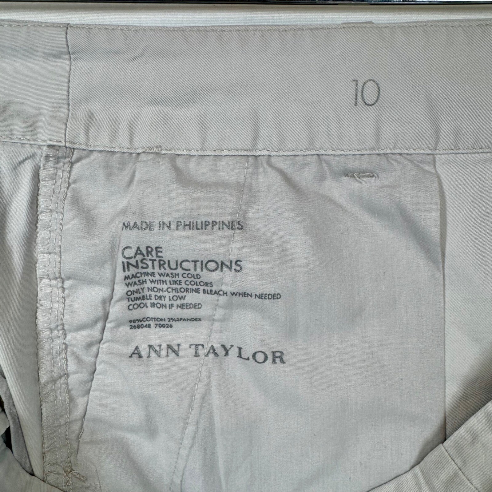 Crisp sophistication defines these Ann Taylor khaki pants, a versatile addition to any wardrobe. Imagine the smooth, comfortable feel of the fabric as you slip them on, ready to conquer your day with effortless style. These cropped chinos feature a classic design with a modern twist, offering a flattering silhouette and a comfortable stretch for all-day wear. The neutral beige color makes them incredibly easy to pair with a variety of tops and shoes, ensuring endless outfit possibilities. Perfect for a casual Friday at the office, a weekend brunch with friends, or a relaxed evening stroll, these pants will quickly become a go-to favorite. Style: Chino Color: Beige Department: Women Type: Pants Material: Cotton, Elastodiene Leg Style: Straight Fabric Type: Twill Features: Stretch, Pockets, Cropped, Comfort, Easy Care Closure: Zip, Button Pattern: Solid Occasion: Casual, Business, Workwear Keywords: Ann Taylor pants, khaki pants women, cropped chinos, beige pants, casual pants, stretch pants, size 10 pants, women's clothing, office wear, business casual, classic style, neutral pants, comfortable pants, everyday pants