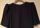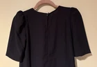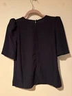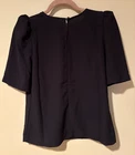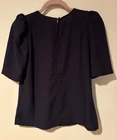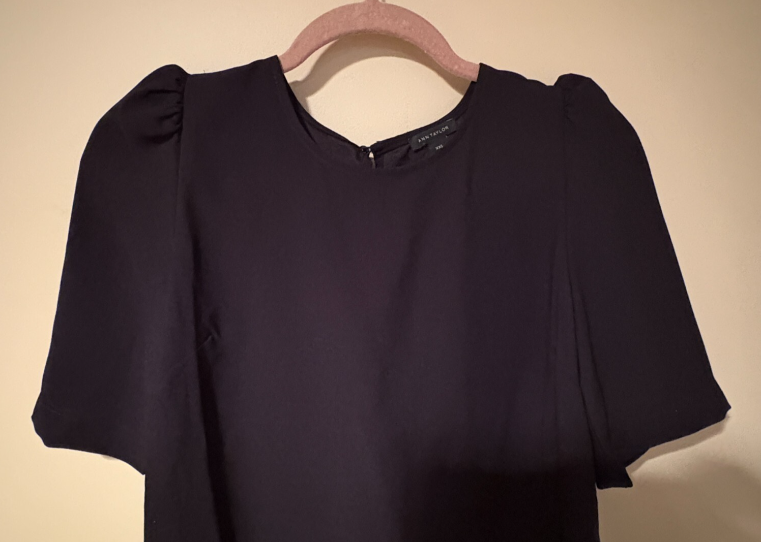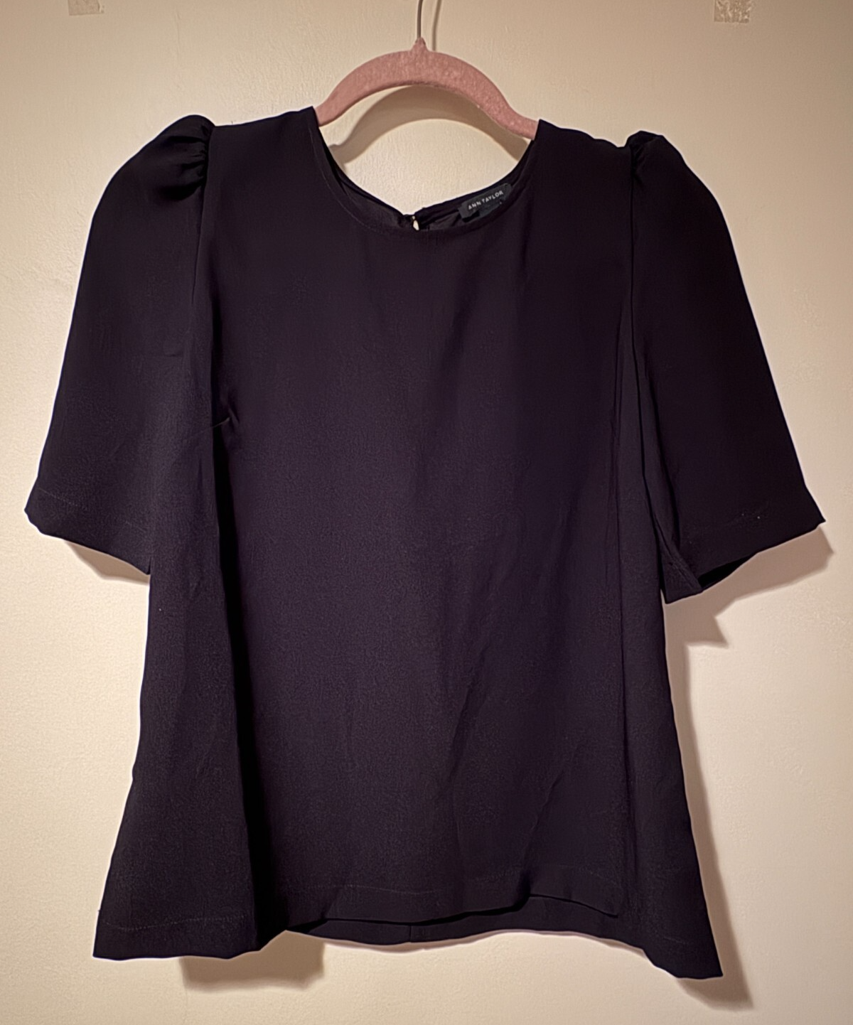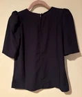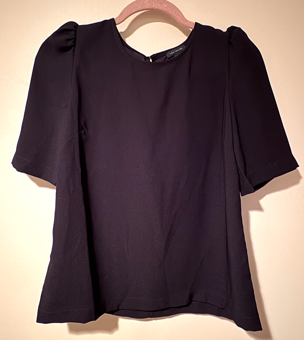 This product is a stylish Ann Taylor women's black puff sleeve top in size XXS. This blouse is made of comfortable and durable polyester material and features a flattering puff sleeve design. Perfect for more formal or casual occasions, this top is a versatile addition to any woman's wardrobe.