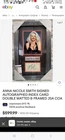 The product is an autographed 8x10 color photo Framed and Matted, signed by Anna Nicole Smith herself and authenticated by GV. The photo is an original piece, signed by Anna Nicole Smith, an American model and actress. The signature adds a personal touch to the item, and it's placed and matted in a large frame, making it a unique collectible for fans around the world of Anna Nicole Smith... The last 2 pictures are for reference price comparison ONLY!!!! I couldn't find one like mine at all so trying to be as accurate as I can. This comes with ๐ฏ % FREE SHIPPING and TRACKING with INSURANCE TO ANYONE IN THE U.S.A.!!!! Thats a $50.00 savings right off the get-go, It's a win-win no matter how you look at it... ๐ Be sure to check out my other listing for more rare and great finds with good savings and FREE SHIPPING GUARANTEED!!!! ๐