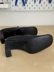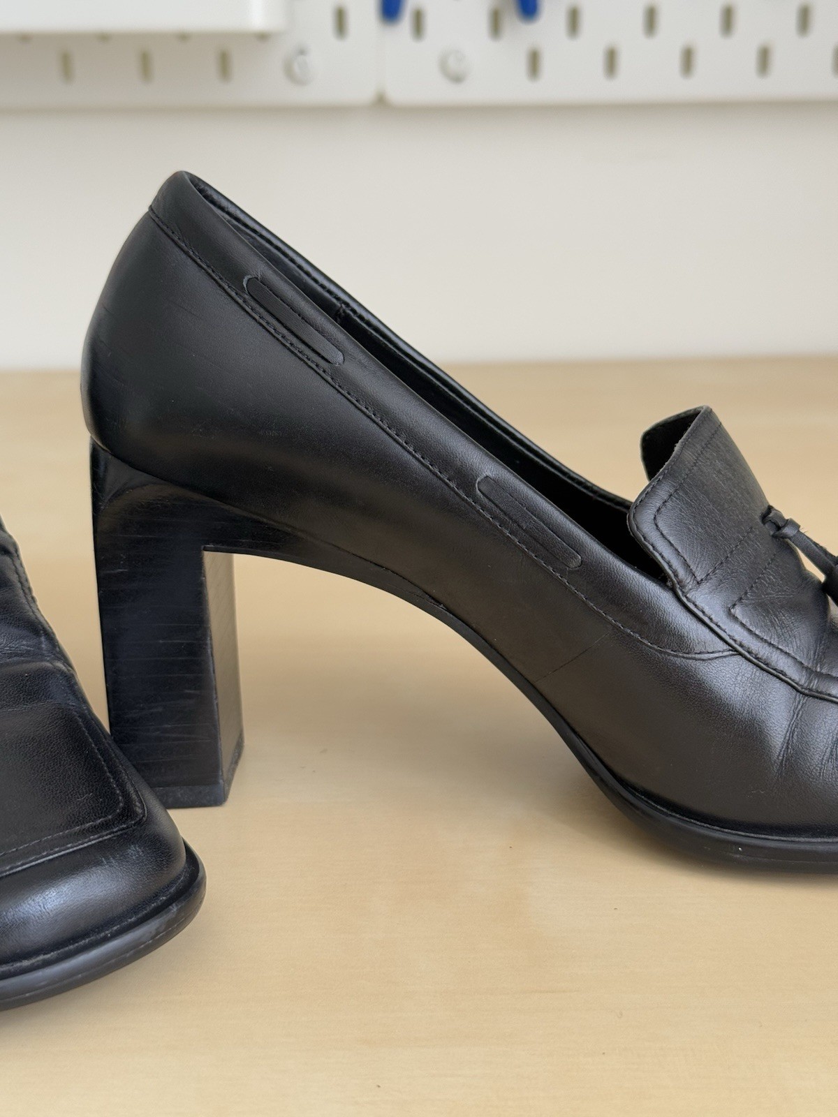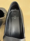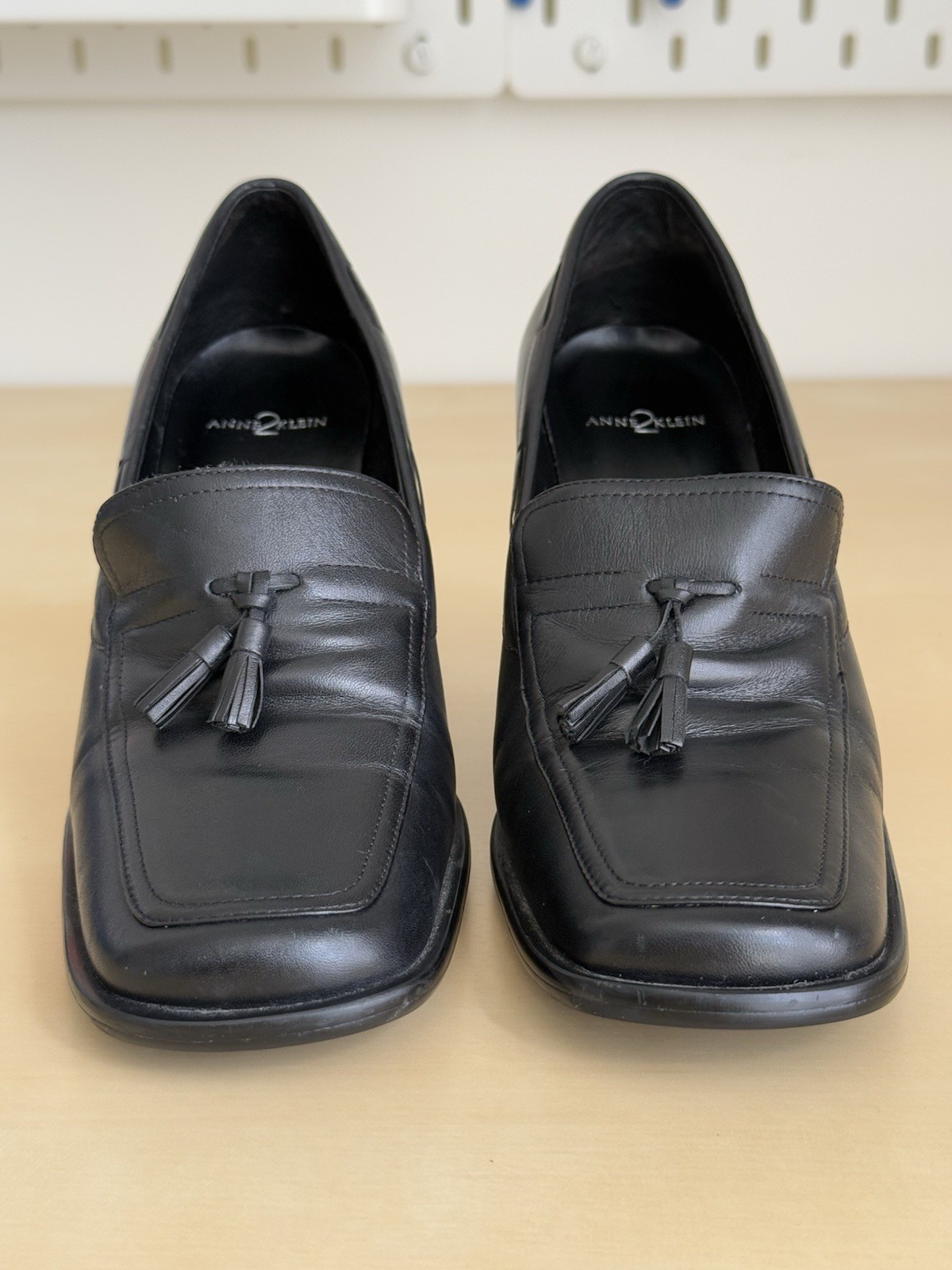 *note the inner sole lifting slightly in heel area- visible in photos* The product is a vintage Anne Klein black leather heel loafer shoe in size 7 for women. This classic 90s-inspired shoe features a tassel detail, making it suitable for casual or business occasions during the summer, fall, and spring seasons. The preppy style and timeless design of this pump make it a versatile and fashionable choice for any wardrobe.