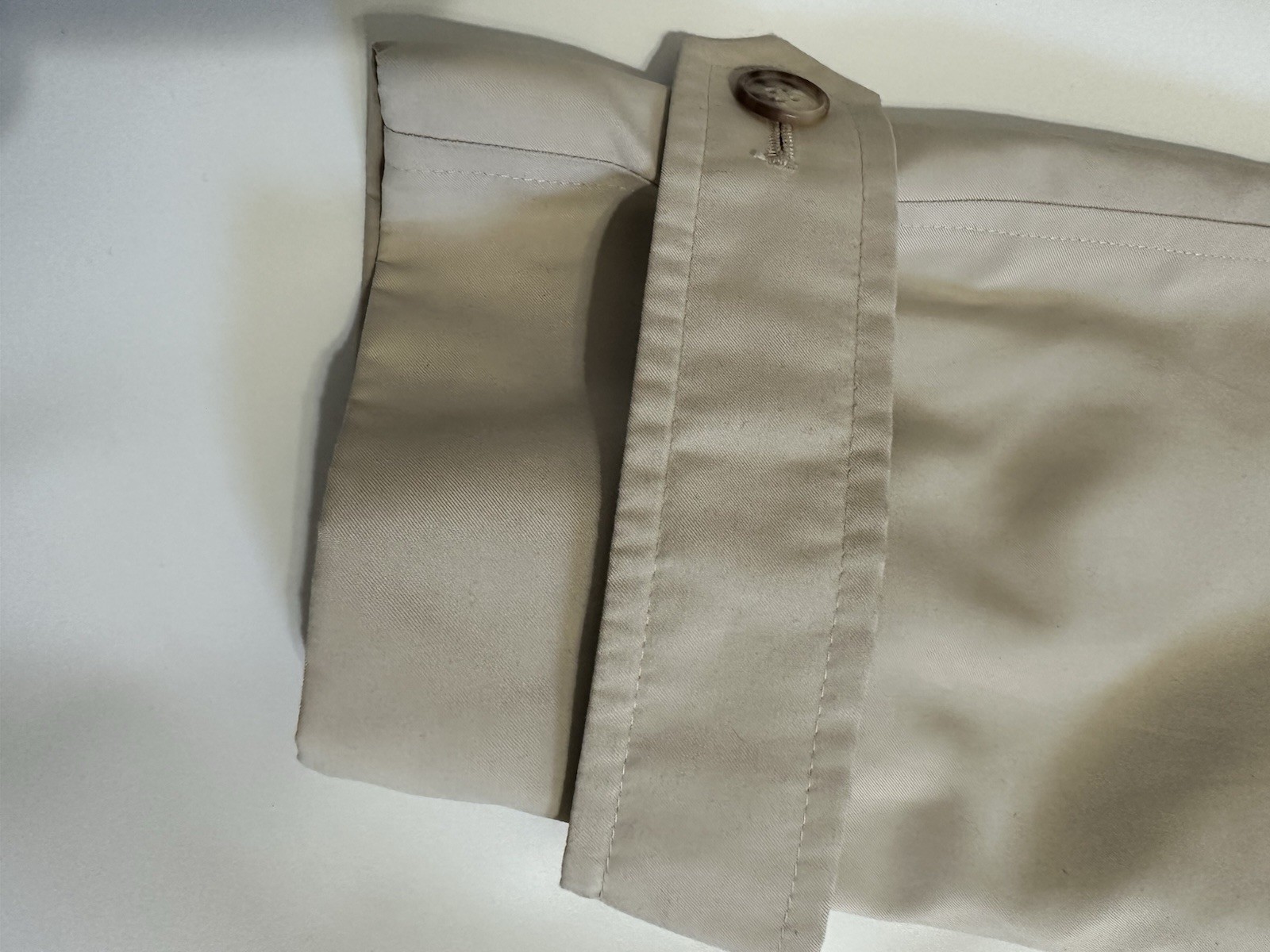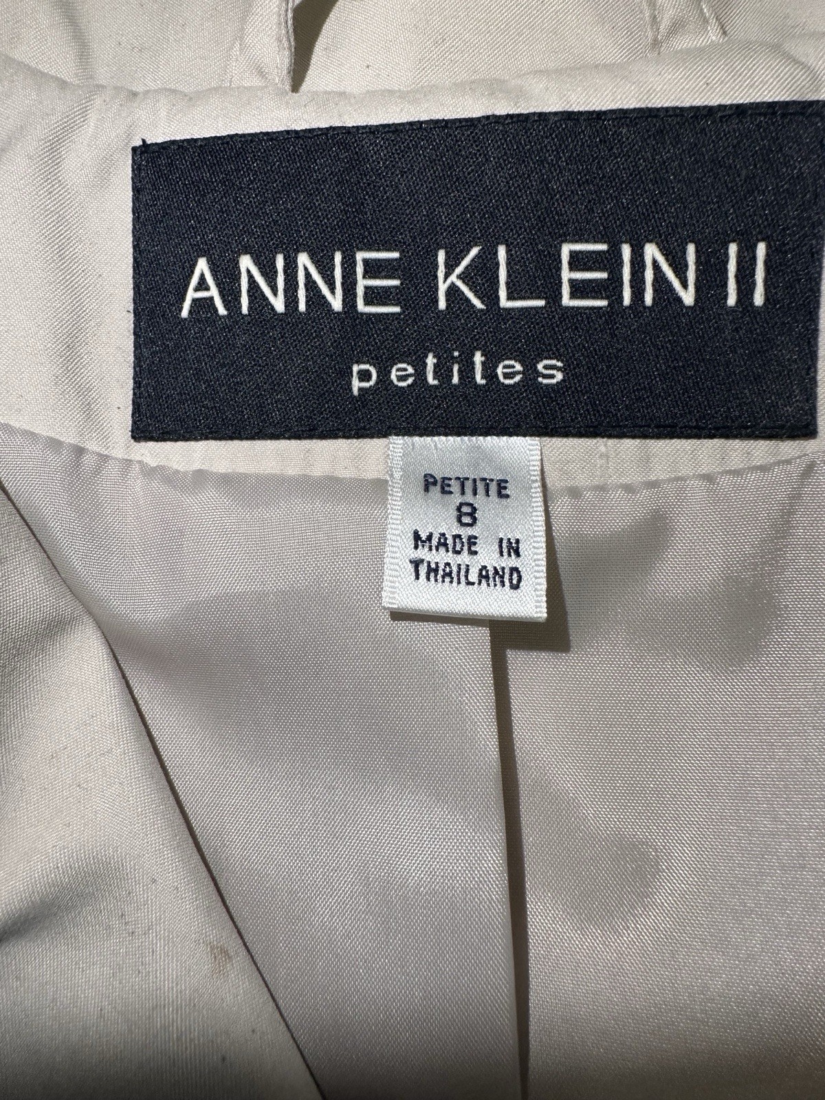 This Anne Klein trench coat for women in size 8 is a classic and stylish outerwear option for the fall and winter seasons. Made from durable polyester material, it features a long length, button closure, and a regular fit. The beige color adds a versatile touch to any casual outfit, while the polyester lining ensures comfort and warmth. Perfect for adding a chic and timeless flair to your wardrobe, this trench coat from a reputable brand like Anne Klein is a must-have for any fashion-forward woman. Shoulder 17 inches Pit-pit 23 Length 47 Sleeves length 23