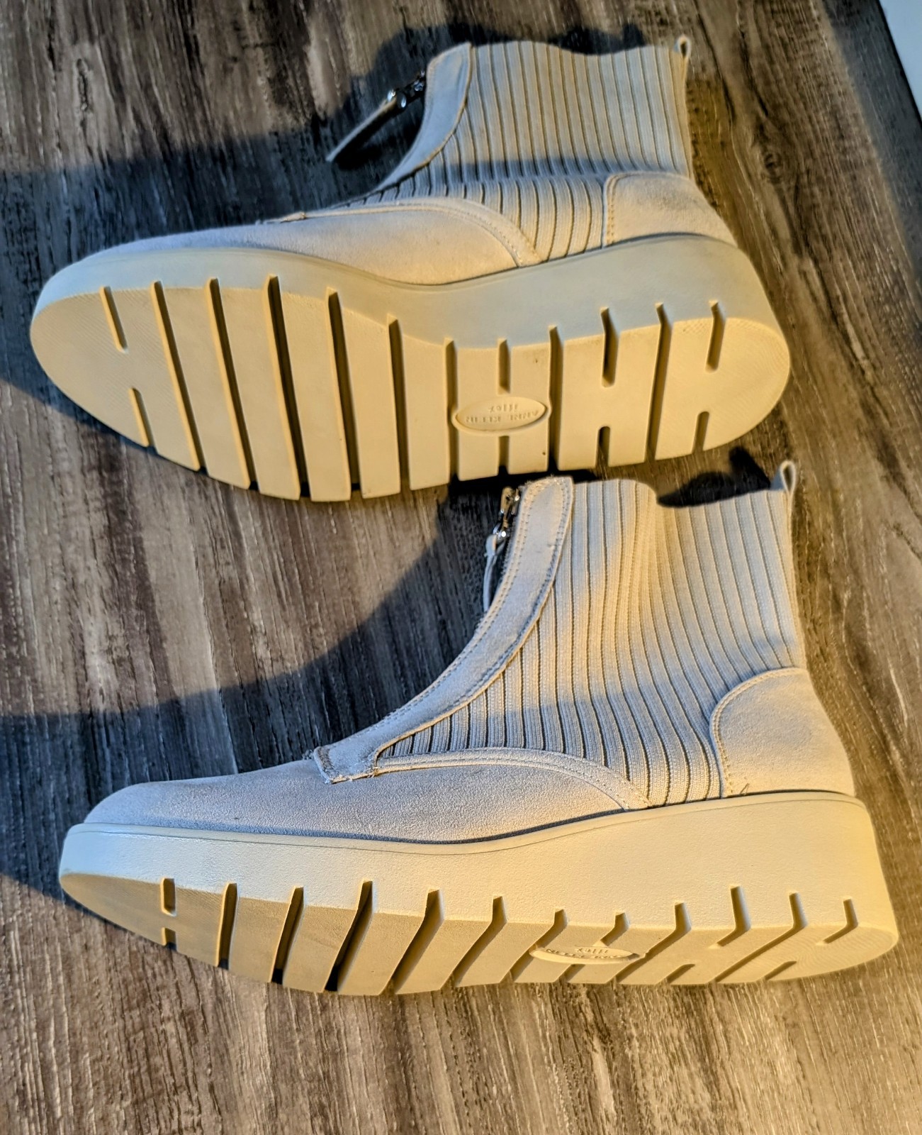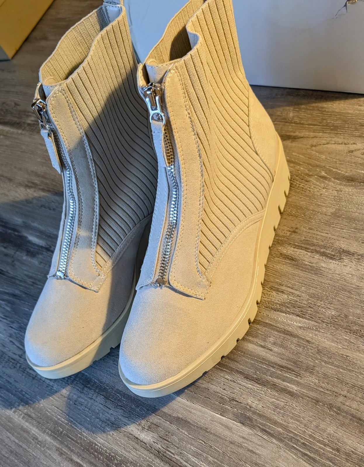 The Anne Klein Women's DEL Zipper Pull On Ankle Boots in size 9.5 are stylish and versatile for casual occasions. Featuring a beige color and block heel, these booties are made of suede with a comfortable polyurethane insole. With a zipper accent and ankle shaft style, these boots are perfect for the winter, fall, and spring seasons. Made in China, these Anne Klein ankle boots offer both quality and fashion in one sleek design. Perfect for women looking for a chic and practical footwear option.