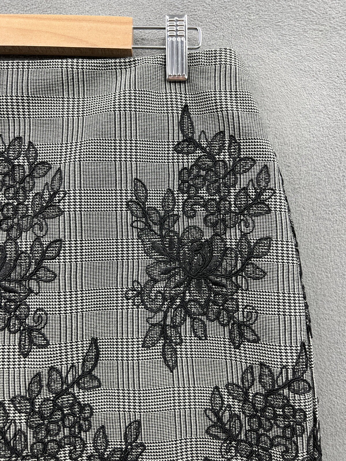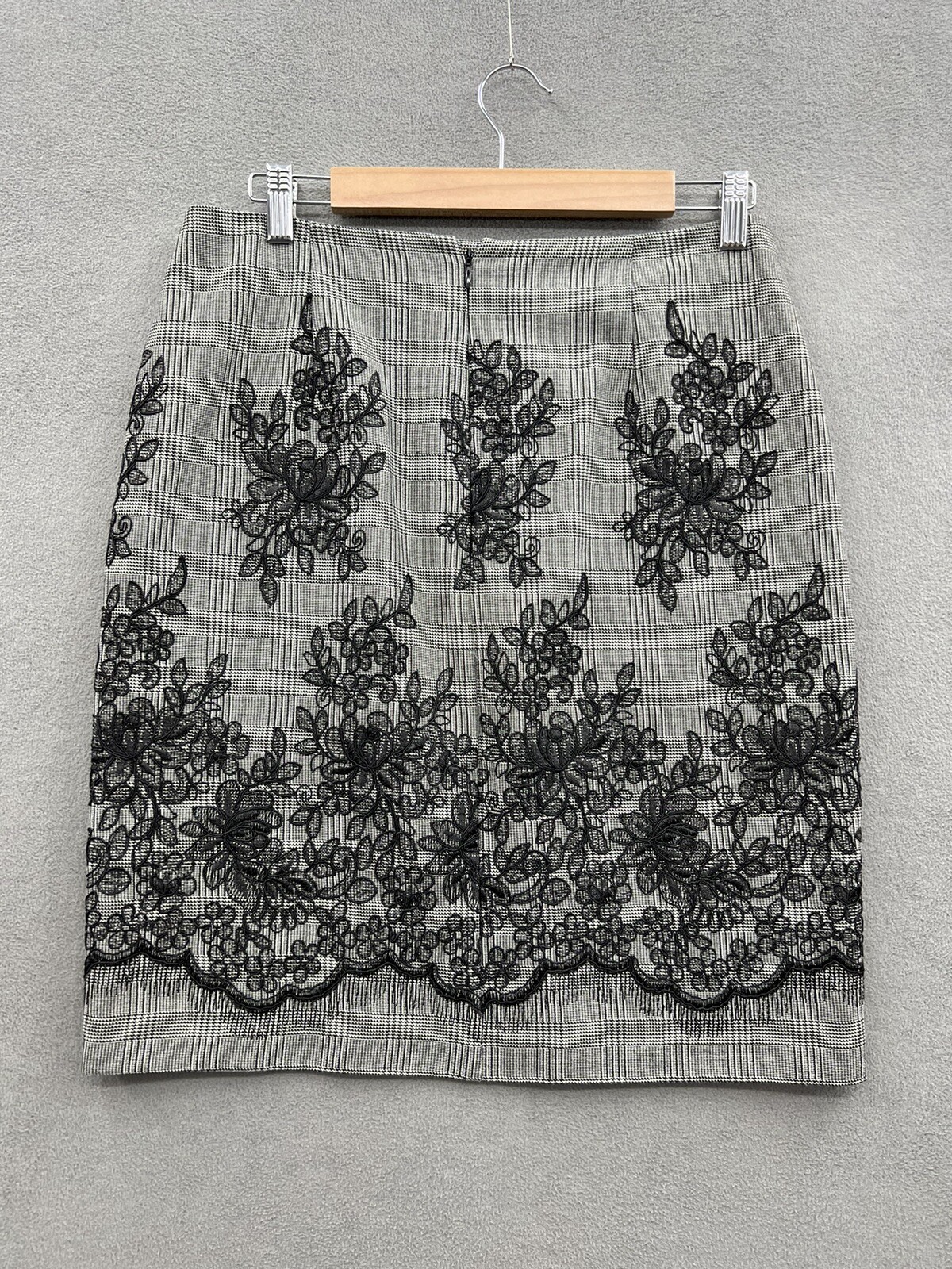 The Anne Klein Pencil Skirt in size 6 features a stylish plaid print with floral lace accents, perfect for various occasions such as weddings, parties, work, or business meetings. The skirt has a zip closure and is made with black color, making it versatile for year-round wear. This knee-length straight and pencil skirt is lined for added comfort and is recommended to be dry cleaned only to maintain its quality. The mid-rise design and classic style make it a staple piece in any woman's wardrobe.