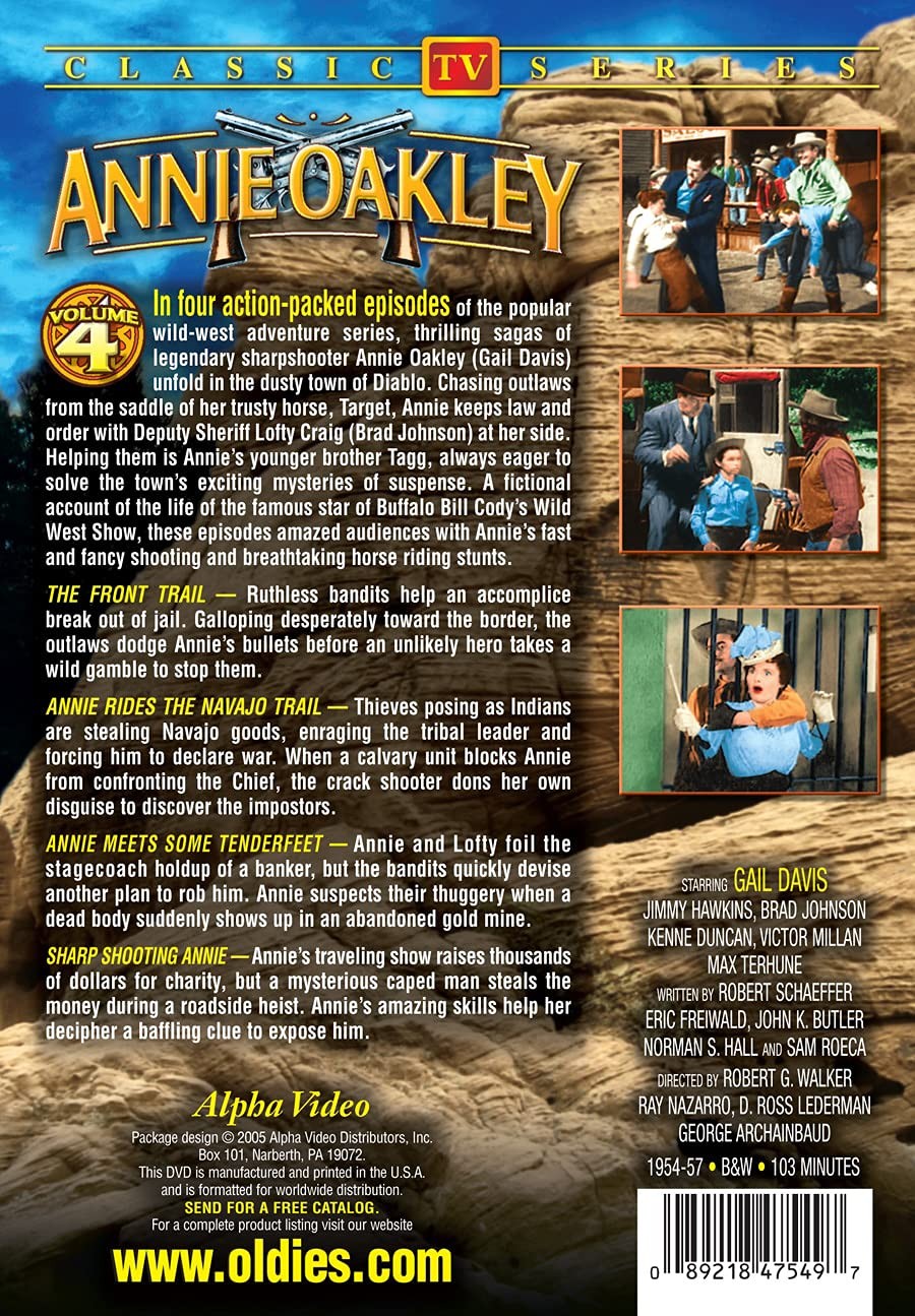 Further Details Title: Annie Oakley - Volume 4 Format: DVD Condition: New Number Of Discs: 1 Release Date: 05/31/2005 Actors: Brad Johnson, Gail Davis, Jimmy Hawkins Director: George Archainbaud, Ray Nazarro, Robert G. Walker Audio Language: English Runtime: 105 Region Code: DVD: 1 (US, Canada...) Studio: Alpha Video Certificate: MPAA Not Rated Description: In four action-packed episodes of the popular wild-west adventure series, thrilling sagas of legendary sharpshooter Annie Oakley (Gail Davis) unfold in the dusty town of Diablo. Chasing outlaws from the saddle of her trusty horse, Target, Annie keeps law and order with Deputy Sheriff Lofty Craig (Brad Johnson) at her side. Helping them is Annie's younger brother Tagg, always eager to solve the town's exciting mysteries of suspense. A fictional account of the life of the famous star of Buffalo Bill Cody's Wild West Show, these episodes amazed audiences with Annie's fast and fancy shooting and breathtaking horse riding stunts. Annie Meets Some Tenderfeet: Annie and Lofty foil the stagecoach holdup of a banker, but the bandits quickly devise another plan to rob him. Annie suspects their thuggery when a dead body suddenly shows up in an abandoned gold mine. Sharp Shooting Annie: Annie's traveling show raises thousands of dollars for charity, but a mysterious caped man steals the money during a roadside heist. Annie's amazing skills help her decipher a baffling clue to expose him. The Tomboy: Traveling by stagecoach on her way into town, Lofty's tomboy niece is robbed at gunpoint by masked bandits. Days later while playing with Tagg she recognizes the outlaws, putting both youths in grave danger. Sure Shot Annie: A pretty newcomer with larceny on her mind charms Lofty before she and an accomplice rob the local bank. The cunning pair's getaway is abruptly thwarted when Annie finds some carelessly discarded evidence. Aspect Ratio: Audio Format: Color / Black & White: Black & White Special Features: DVDs ARE REGION 1 UNLESS OTHERWISE STATED Missing Information? Please contact us if any details are missing and where possible we will add the information to our listing.