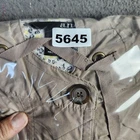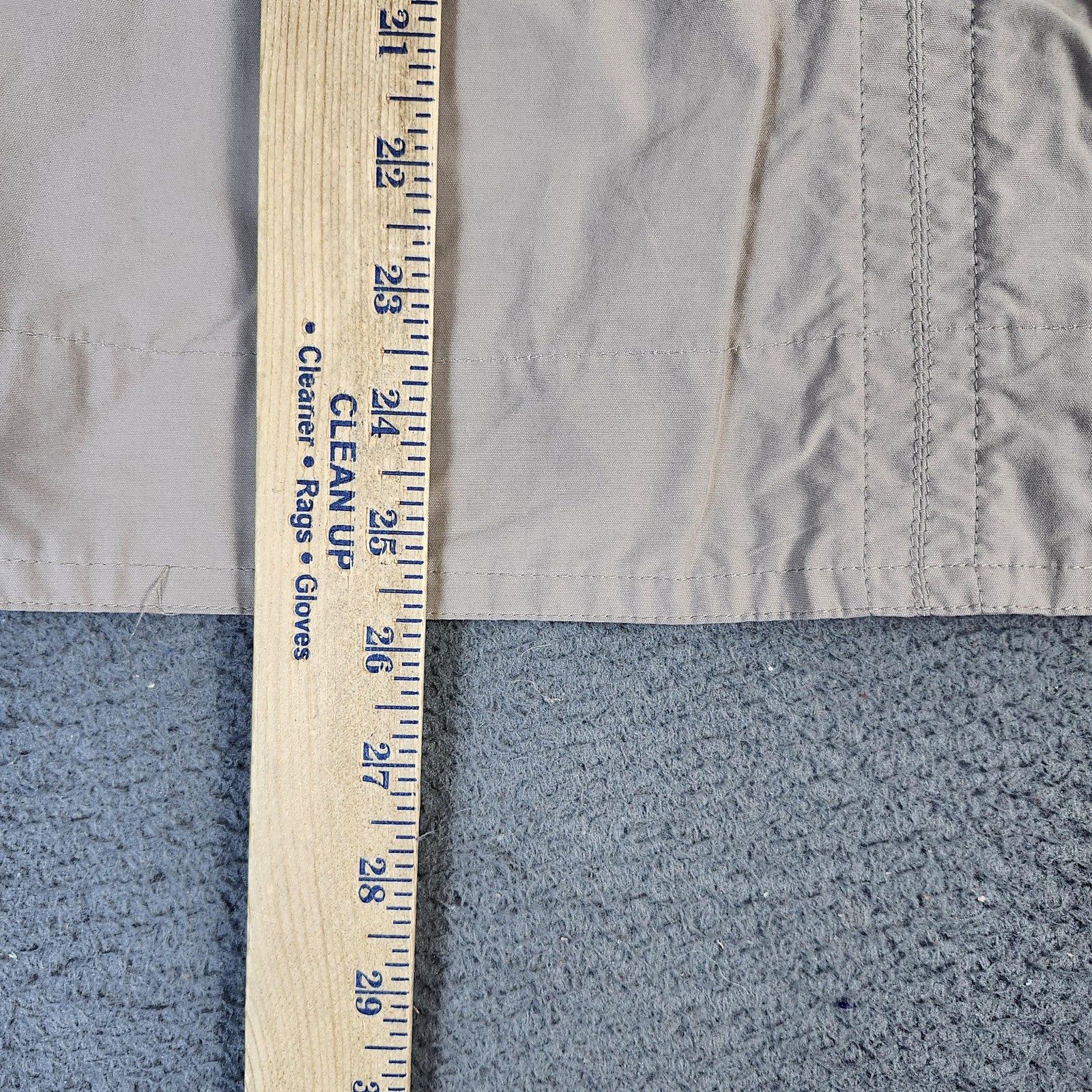 Item: Womens hooded anorak utility jacket Color: Beige / light khaki Size: Womens Medium (tag not clearly visible; estimated fit) Features: Button-front closure; adjustable drawstring waist with toggles; two front snap-flap pockets; attached hood; roll-tab sleeve capability; lightweight woven shell; back yoke detail Logos/Branding: Interior label present (not fully legible in photos) Material: Not listed on visible tags; lightweight woven fabric Style/Model codes: None visible in photos UPC/EAN/ISBN: Not visible Notes: Color tone may vary slightly due to lighting and screen settings.