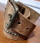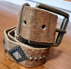 Another Line Distressed Italian Leather Wide Gold Belt Studded Brass Buckle. Size Medium Great pre-owned condition with one stone missing as shown in pictures. Shipped USPS ground advantage. Message me with any questions for a prompt reply. Be sure to check out and consider following my eBay shop thriftThippie to see more amazing items listed daily. Y'all stay safe healthy and happy!!!
