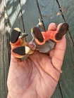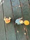 Add a touch of whimsy to your home decor with this charming lot of two ANRI wood handcrafted clown figurines. Each figurine stands at 4.5 inches tall and features a unique asymmetrical shape with intricate carvings and hand-painted details. The clowns are holding yellow balloons and are perfect for any room, including the office, living room, dining room, and even the hallway. These limited edition and special edition figurines are perfect for collectors and those who appreciate handcrafted art. The clowns are made of high-quality wood and are suitable for display on furniture and windows. This lot is an excellent addition to any collection and will surely bring a smile to your face. One missing the ball