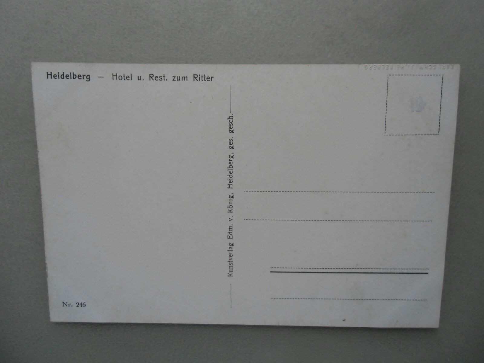 Ansichtskarte Heidelberg Hotel und Rest. zum Ritter Sprache Deutsch Gewicht ca. 20 g Bestell-Nr 59685 Bemerkungen - Ansichtskarte Heidelberg Hotel und Rest. zum Ritter (--- Suchworte: )Sie finden jeweils ein Foto der Vorder- und Rückseite der Ansichtskarte. Diese Fotos sind Bestandteil unserer Zustand- und Artikelbeschreibung. In der Regel sind die Ecken und Kanten gering / etwas bestoßen. - 542 - Lagerfach: 904-542-E17 Schlagworte Baden-Württemberg, Deutschland, Ansichtskarte, Baden-Württemberg, Ortsansicht, Landeskunde, Ortsgeschichte Unser Preis EUR 13,50 (inkl. MwSt.) Versandkostenfrei innerhalb Deutschlands Weitere Abbildungen Aufgenommen mit whBOOK Sicheres Bestellen - Order-Control geprüft! Artikel eingestellt mit dem w+h GmbH eBay-Service Daten und Bilder powered by Buchfreund (2025-12-08)