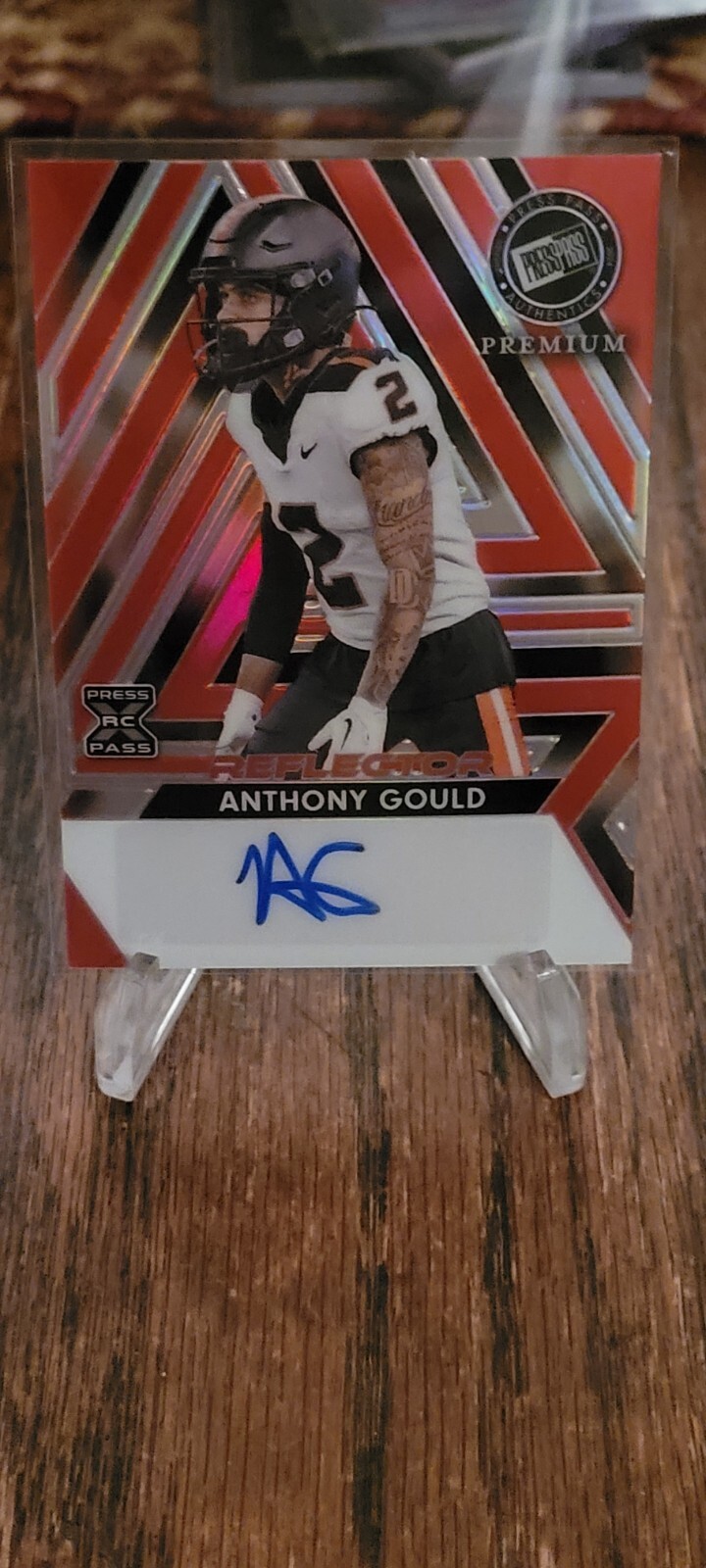 This rare and highly sought-after sports trading card features the autograph of Anthony Gould, a standout player from the Oregon State Beavers and current member of the Indianapolis Colts. The card is from the 2024 Leaf Press Pass Premium set and is a red reflector autograph with a print run of only 10. 4/10 In addition to the autograph, this card also features serial numbering, making it a valuable addition to any collection. The autograph is authenticated by Leaf, ensuring its authenticity. Don't miss out on this opportunity to own a piece of football history with this stunning Anthony Gould trading card.