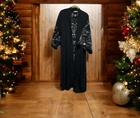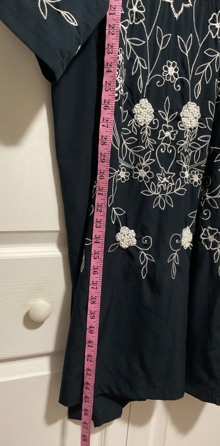 The Anthropologie Floreat Navy Longline Duster Kimono is a stylish and versatile piece perfect for a variety of occasions. Made of lightweight polyester, this kimono features intricate floral embroidery and beadwork, adding a whimsical and bohemian touch to your outfit. The long length and 3/4 sleeves make it an ideal choice for summer, fall, and spring, while the one size fits most design allows for a relaxed and comfortable fit. Whether you're traveling, dressing for a casual day out, or simply lounging at home, this kimono is a must-have addition to your wardrobe.