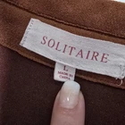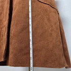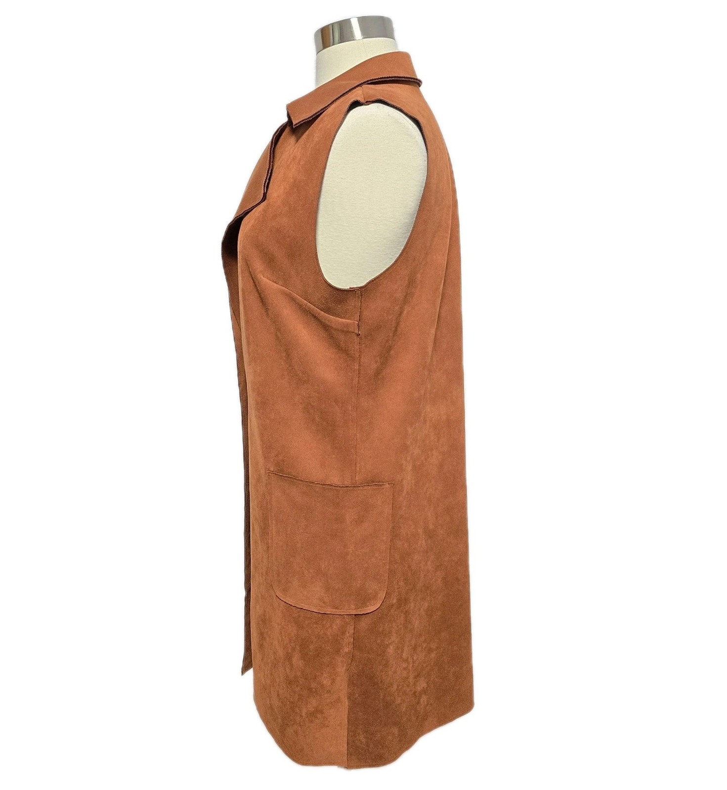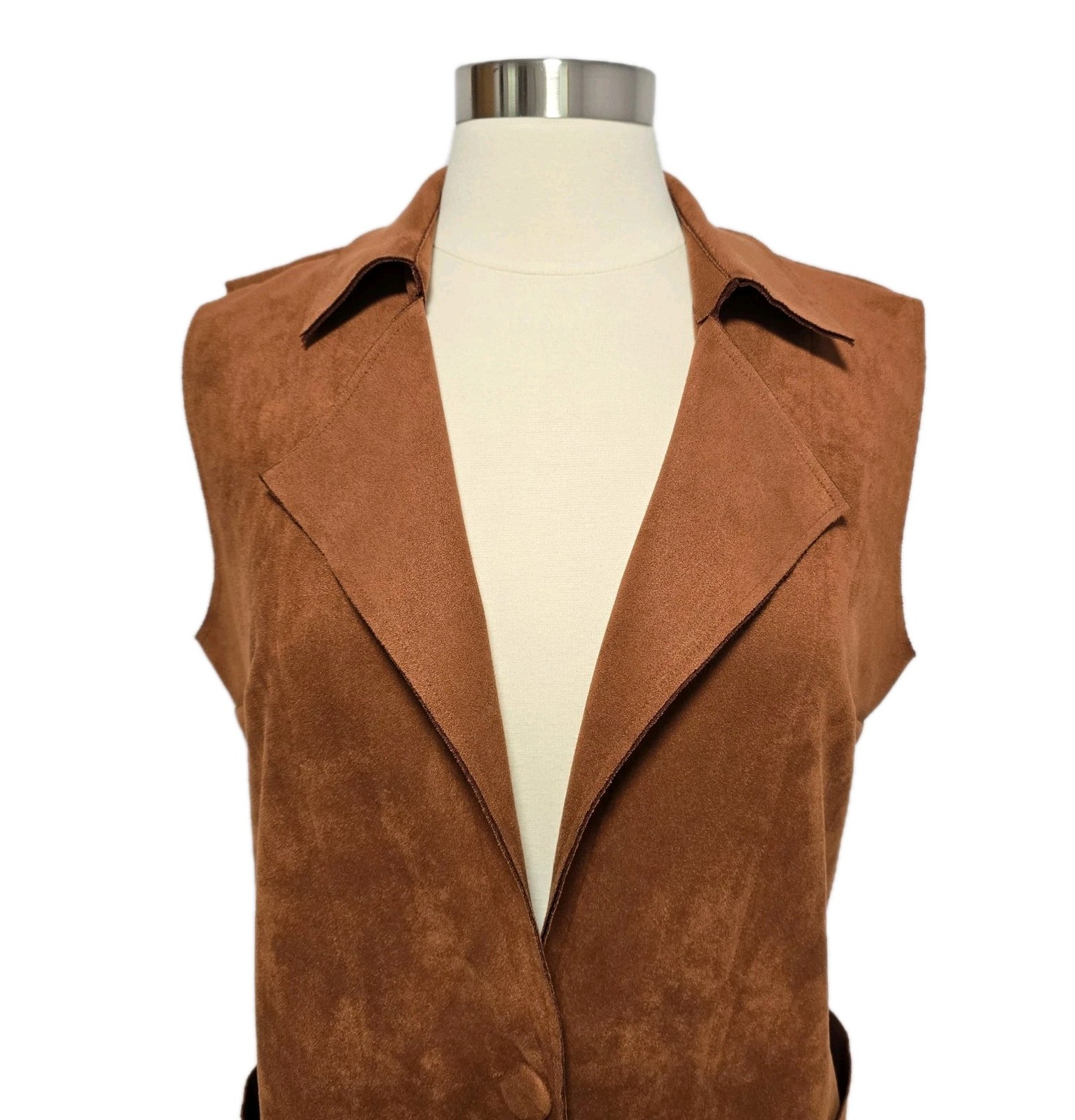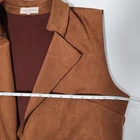 The Anthropologie Solitaire Faux Suede Duster Vest in size Large is a versatile and stylish piece perfect for any occasion. This mid-length, sleeveless vest features a solid amber brown color with a covered button front close and notch collar for added flair. Made with faux suede fabric, it is easy to care for with machine washable instructions. The duster style and hippie theme make it a trendy and comfortable addition to any wardrobe, suitable for travel, parties, casual outings, or workwear. With its faux suede lining and practical pockets, this vest is a must-have for women looking to add a touch of vintage-inspired charm to their look.