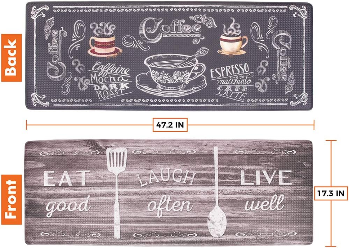 Anti Fatigue Kitchen Floor Mat, Reversible Cushioned Memory Foam Kitchen Rug Pad, Waterproof Non-Slip Padded Comfort Standing Mat Office Home, 47x17 (Farmhouse Coffee Kitchen) REVERSIBLE ANTI FATIGUE KITCHEN MAT RUG, SINGLE MAT: Made with 12mm Thick Cushion PVC for ultimate all day comfort, Measures 17.3 x 47.2 (W x L) inches, Farmhouse coffee cup and eat laugh wood patterns to match any home kitchen, sink and stove, office desk, laundry floor decor. COMFORT STANDING MAT Perfect for everyday use and office standing desk mat. It is ergonomically engineered and provides all day foot support. It helps eliminate pressures from standing, reduces fatigue, relieves joint and back aches. All-PURPOSE CUSHION FLOOR MAT This cushion support floor mat is anti-slip and can be used indoor on multiple floor surfaces like wood, carpet, concrete, marble, etc.. Ideal for workstation, standing desk, kitchen floor, and home decoration. Good for personal use, but also makes a great gift for family or office. REVERSIBLE PATTERN Designed in the USA. This floor mat has two different print patterns and colors on the front and the back side. The reversible design allows you to switch styles depending on your mood, and will easily match any kitchen and office decor. QUALITY AND DURABLE Made with high quality Eco-Friendly Non-Toxic High Density PVC, this thick floor pad provides the maximum durability and stability. It is water resistant and easy to clean and prevents stains, spills, and dirt on your flooring. Product Description This cushion support floor mat is anti-slip and can be used indoor on multiple floor surfaces. Ideal for workstation, standing desk, kitchen floor, and home decoration. Perfect for everyday use and office standing desk mat. It is ergonomically engineered and provides all day foot support. Designed in the USA. This floor mat has two different print patterns and colors on the front and the back side, and will easily match any kitchen and office decor. Available in 2 Sizes and 6 Styles. Made with high-quality Environment-Friendly Non-Toxic High Density PVC, it is waterproof and easy to clean. Reversible Decorative Ergonomically Engineered Rug Non-Slip Design With Beautiful Designs To Match Your Home Anti Fatigue Comfort Floor Mat With 12 MM Foam Cushion Waterproof Easy to Clean And Stain Resistant Item model number OP-FM01-M-PT06 Item Thickness 12 Millimeters Color Coffee/Kitchen Pattern Letter Print Item Weight 3.52 pounds Material Non-toxic PVC Shape Rectangular Material Type Free Free of all materials except PVC Special Feature Cushioned, Waterproof, Anti-Slip, Durable Product Dimensions 47.2"L x 17.3"W x 0.47"Th Product Care Instructions Laundry Size 47.2" x 17.3" - Single Piece 17.3 "th x 47.2 "th x 0.47 "th. Weight: 3.52 lb Shipping from the USA All of our products are shipped from the USA, ensuring quick delivery to your destination. Payment We offer the following payment methods: PayPal, credit card, bank transfer, and eBay's secure payment system. Free Shipping & Free Returns Shipping within the USA is FREE. Additionally, any return is absolutely free for you. Risk-Free Purchase You have the option to return an item within 30 days without any justification. We cover the return shipping costs! Fast Shipping We ship immediately upon receipt of payment. Generally, the package is delivered within 2-3 days in the USA. If it takes longer, we will contact you. Quality and Costs Made in Europe, USA, China No customs fees or additional charges Total satisfaction guarantee Invoice with declared VAT available upon request in .pdf format Feedback Your feedback is very important to us. After you pay for your purchase, you will automatically receive positive feedback from us.