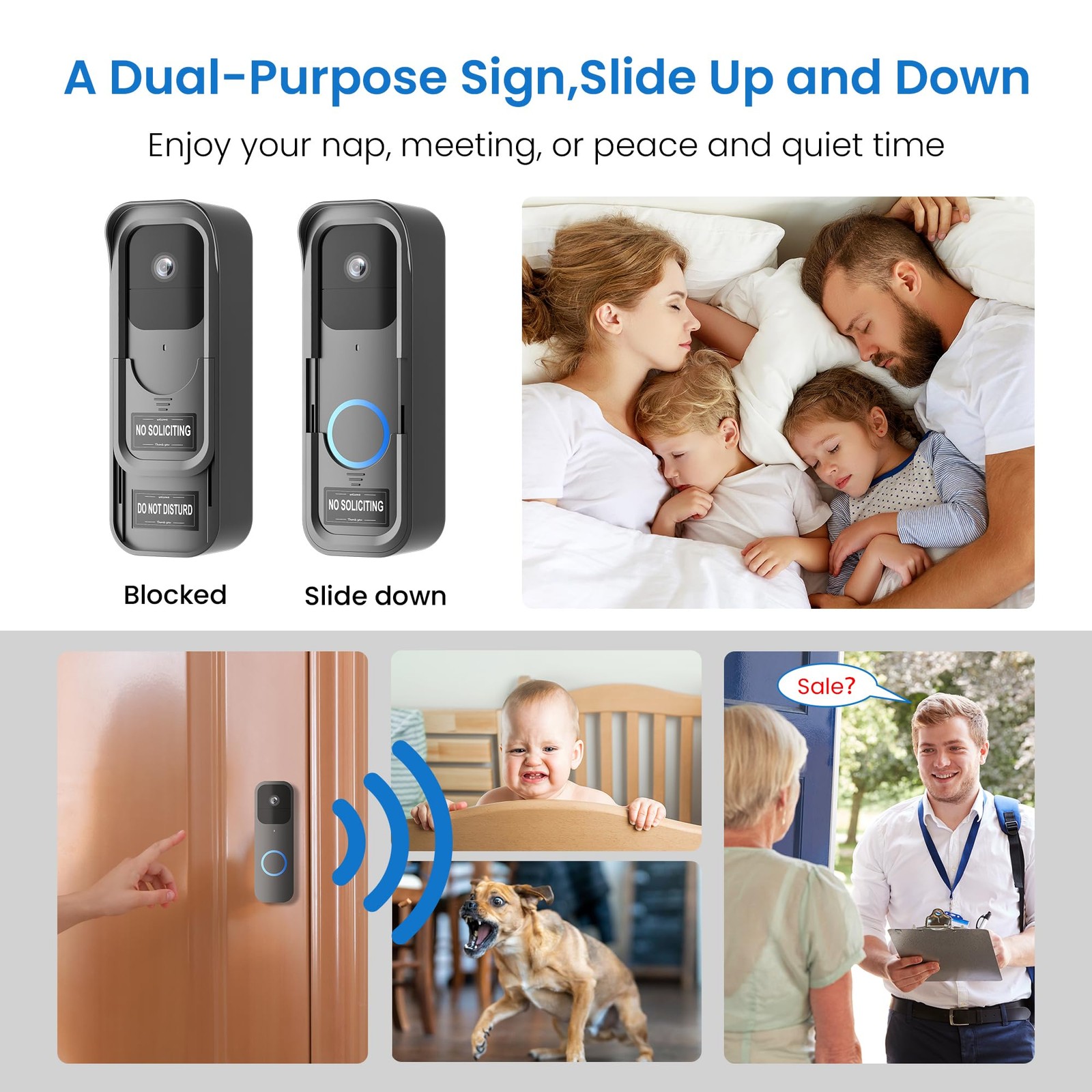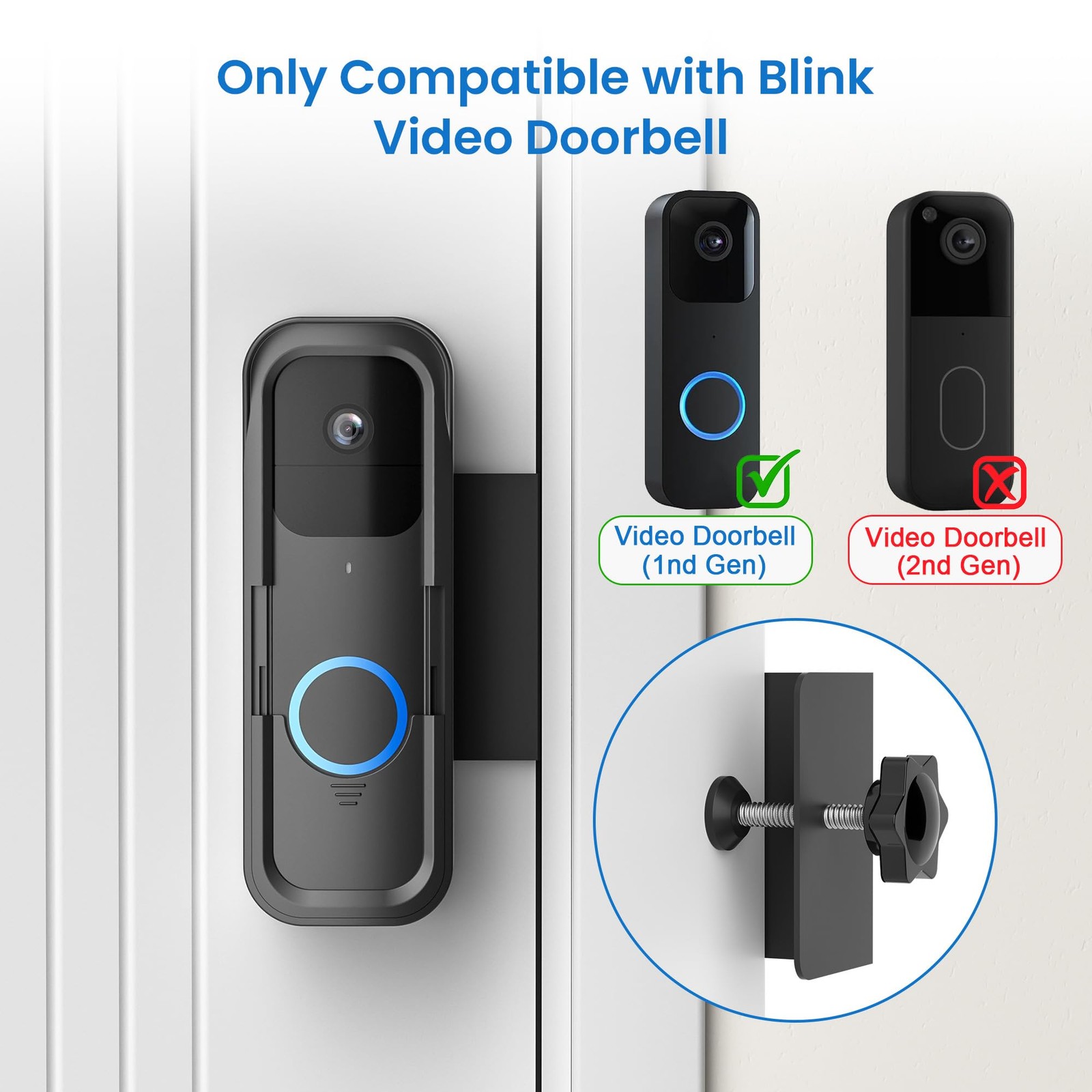 Doorbell is Not Included in Package Our doorbell mount is compatible for blink video doorbell (1st Gen) (1st Gen) , ideal for condo,apartment,office room, rental, dorm. The doorbell mount will protect your video doorbell from all kinds of potential damage in any circumstance and prolong your device working life.and it won't influence the two-way audio or night vision,ensure your household satety in an all-round way. All New Design Can Slide Up and Down Doorbell Mount Cover Covers Button But Not The Camera: Clearly indicate that you do not want to be disturbed while still being able to use the camera to perform certain doorbell functions and protect your privacy from being invaded. Looks cool and futuristic. Solves unwanted doorbell ringing and soliciting of your home. Enjoy your nap, meeting, or work. Sleep like a baby with no more dog barking at the ring. Fitted with a Stick-on Dual-purpose Sign! In addition to the pre-made signs.we’ve included an extra set of blank stickers, giving you the freedom to create your personalized warning messages that fit your household’s unique needs. Features: 1.The doorbell camera mount provides full weather protection,extending the device's lifespan. 2.With doorbell holder bracket,put the video doorbell fit perfectly inside. 3.No drilling design can avoid damaging the integrity of the door panel. 4.No tools required,quick installation within seconds. What's in the box: Video doorbell mount Screwdriver Small screws Product manual Compatible with Blink Doorbell Mount: ONLY designed applicable for Blink Video Doorbell (1st Gen) for apartments, offices, rentals and dormitories (NOTE: Not include Video Doorbell) All New Design: Upgraded slide up and down for doorbell camera mount.The package includes four sets of "NO SOLICITING" and "DO NOT DISTURB" signs.These signs help deter salespeople and reduce disturbances that could wake a sleeping baby or dog Compatibility Door: applicable for blink doorbell mount no drill compatibility doors that be opened inward! Iron security door & storm doors & screen doors & Glass door can not use.NOTE: Door thickness must be between 1.4" and 2.3". The distance between door and door frame is more than 0.06".Please measure before purchasing to make sure it fits your door No-Drill & Easy Installation: Simply place applicable for blink video doorbell inside and slide it over your front door, then adjust the fixed clip according to your door thickness.The silicone pad on the back of the door bell mounting bracket provides optimal friction to keep the bracket stable and secure Premium Material: Compatible with Blink doorbell holder is made of premium hard plastic cover & back panel and metal. It is tight and secure. All the holes of doorbell cover are well designed and won't block doorbell motion sensors and two-way audio What You Will Get: 1 x video doorbell mount.Warning Signs,installation instructions and various installation accessories.If you are have any questions about for Doorbell Mount, please do not hesitate to contact us via the "Contact Seller" entrance on Amazon