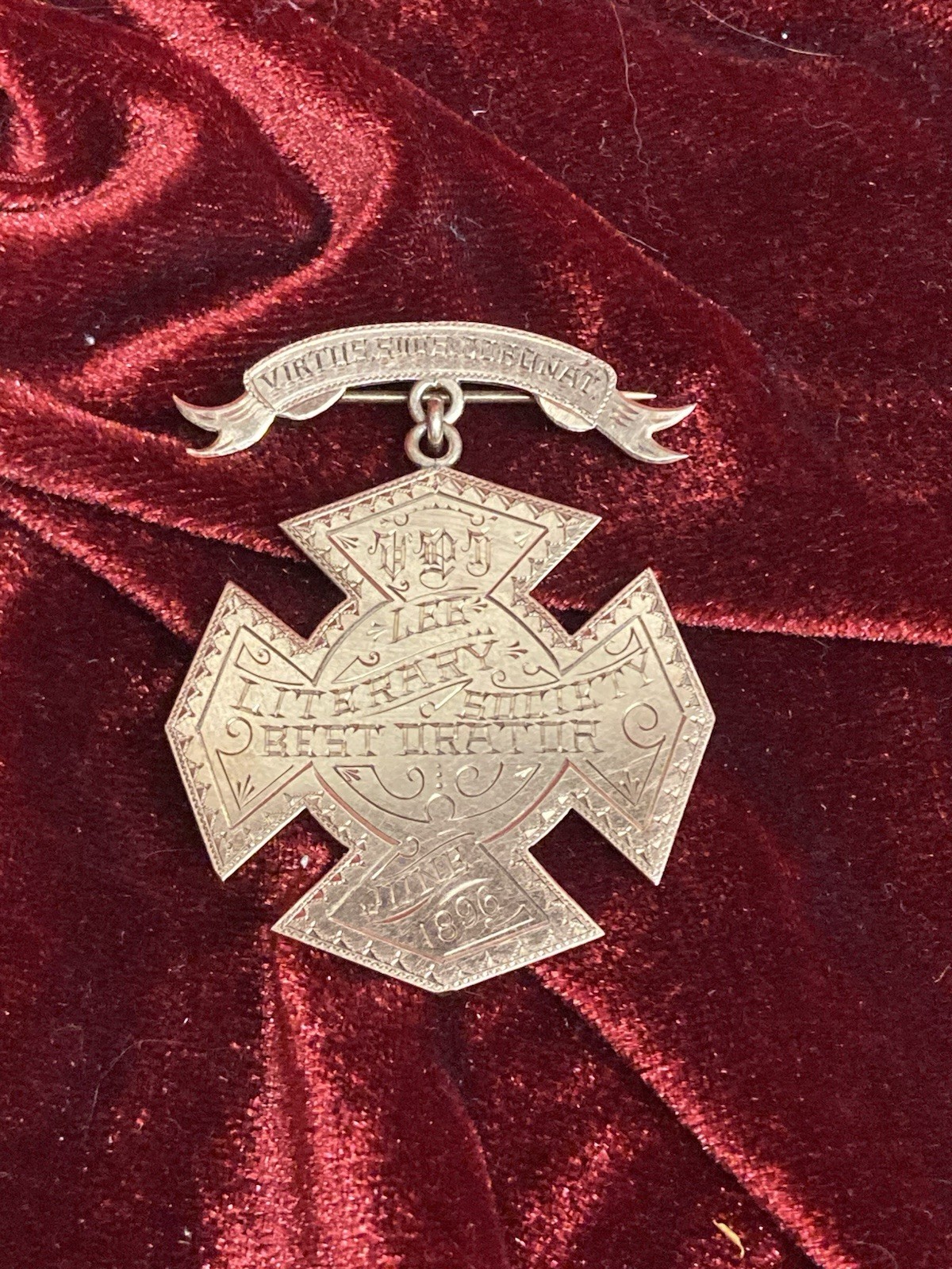 Rare 1896 Lee Literary Society Gold Oratory Medal Named to John Lloyd Phillips – Virginia Agricultural & Mechanical College Offered is a rare late-19th-century Lee Literary Society presentation medal dated June 1896, awarded for “Merit – Best Orator.” The medal bears the Latin motto: VIRTUS SUOS CORONAT (“Virtue crowns her own”) and the reverse is engraved: “Awarded to J. Lloyd Phillips.” The Lee Literary Society was one of the principal student literary and debating societies at the Virginia Agricultural & Mechanical College (later Virginia Polytechnic Institute, now Virginia Tech). These societies held formal competitions in debate and oratory, awarding medals to the best speakers during annual celebrations. ⸻ Hand Engraved Craftsmanship One of the most striking features of this medal is the craftsmanship. The entire design and lettering are masterfully hand engraved, including: • the decorative cross design • all lettering on the face • the Latin motto banner • the inscription on the reverse The engraving shows the confident line variation and depth characteristic of late-19th-century professional engraving, with crisp lettering and finely cut ornamental detail. Unlike later stamped medals, this piece was individually engraved by hand, making each example unique. ⸻ Identified Recipient Research assistance from Virginia Tech Special Collections and University Archives identifies the recipient as: John Lloyd Phillips (Class of 1900) Phillips later became an important figure in Virginia agricultural science: • Instructor in Entomology at Virginia Polytechnic Institute (1899–1901) • Assistant State Entomologist (1901–1903) • State Entomologist and Pathologist (1903–1906) • State Entomologist (1906–1910) Virginia Tech archivists also located a contemporary 1896 Virginia newspaper mention confirming Phillips received the Lee Literary Society oratory award. ⸻ Gold Content Weight: approximately 12 grams The medal has been twice independently scratch-tested using acid and confirmed to be at least 10 karat gold. The alloy shows a warm reddish tone typical of late-19th-century American gold alloys, suggesting the purity may fall between 10K and 12k, though does not hold up to 14 karat testing and no destructive testing has been performed. Again, please note: the alloy shows a warm reddish tone similar to what we know of today as a rosy/coppery colored gold. For some reason it appears as more yellow in the photos than in person. Condition: Very good antique condition. • Crisp engraving • Strong detail throughout • Light age wear consistent with use • Original period pin assembly intact No repairs observed. Please review photographs for details. ⸻ Historical Significance The Lee Literary Society played a central role in the intellectual life of Virginia Agricultural & Mechanical College during the late 19th century. Literary societies were the primary forums for public speaking, debate, and rhetoric, training many future lawyers, professors, and public officials. This medal represents an award given for excellence in oratory during that era. Its recipient later became Virginia’s State Entomologist, linking the object to the early scientific history of Virginia Tech. *** Virginia Tech Virginia Polytechnic Institute VPI Virginia Agricultural & Mechanical College Lee Literary Society Victorian academic medal Oratory medal Debate medal 19th century university award Gold academic medal Hand engraved medal