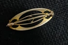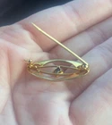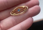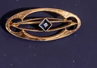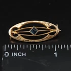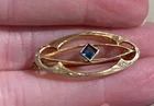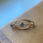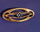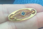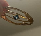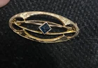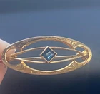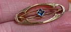 About 1” wide 1.60 grams Marked 10k Early 1900s Antique Minor scuffs to stone Clasp is a bit difficult to open/stick is slightly bent at end Stone is likely blue glass Faceted yellow gold