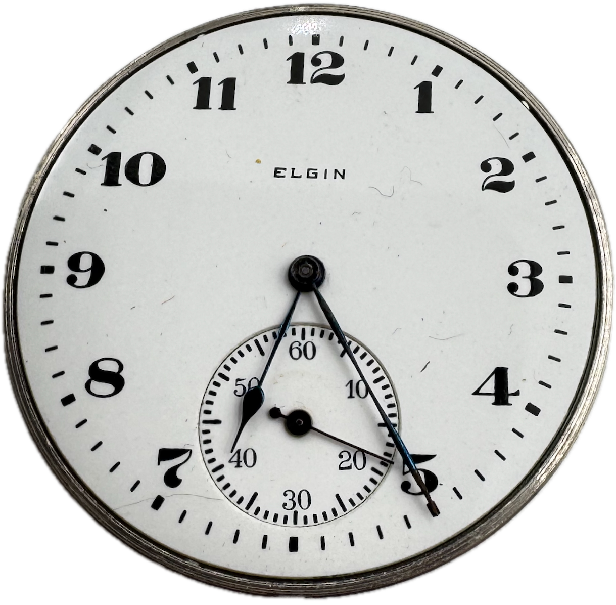 Antique 12s 1921 Elgin 7 Jewel Mechanical Pocket Watch Movement 303 USA Product Description Item: Pocket Watch Movement Brand: Elgin Movement: Mechanical Production Year: 1921 Country: USA Jewels: 7 Jewel Gender: Men's Grade: 303 Size: 12s Product Measurements Diameter: 39.5mm Product Condition Overall Condition: Fair, overall condition for its age. Functions: Running, but may be in need of service. This means, it can run unreliably, start or stop and timekeeping is not guaranteed. Dial: The dial has hairline crack(s) on it. Hands: There is discoloration on the hands.