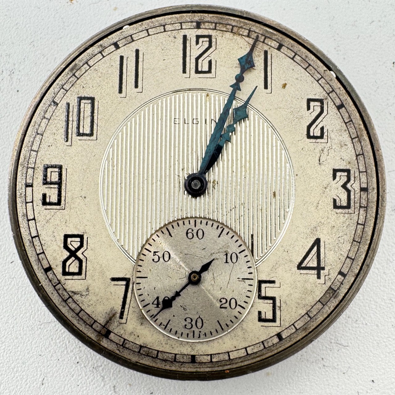 Antique 12s 1925 Elgin Pinstriped 7 J Mechanical Pocket Watch Movement 303 USA Product Description Item: Pocket Watch Movement Brand: Elgin Model: Pinstriped Movement: Mechanical Production Year: 1925 Country: USA Jewels: 7 J Gender: Men's Grade: 303 Size: 12s Product Measurements Diameter: 39.5mm Product Condition Overall Condition: Poor, overall condition for its age. Functions: Not running, the Balance staff is broken. Dial: The dial has scratches and discoloration.