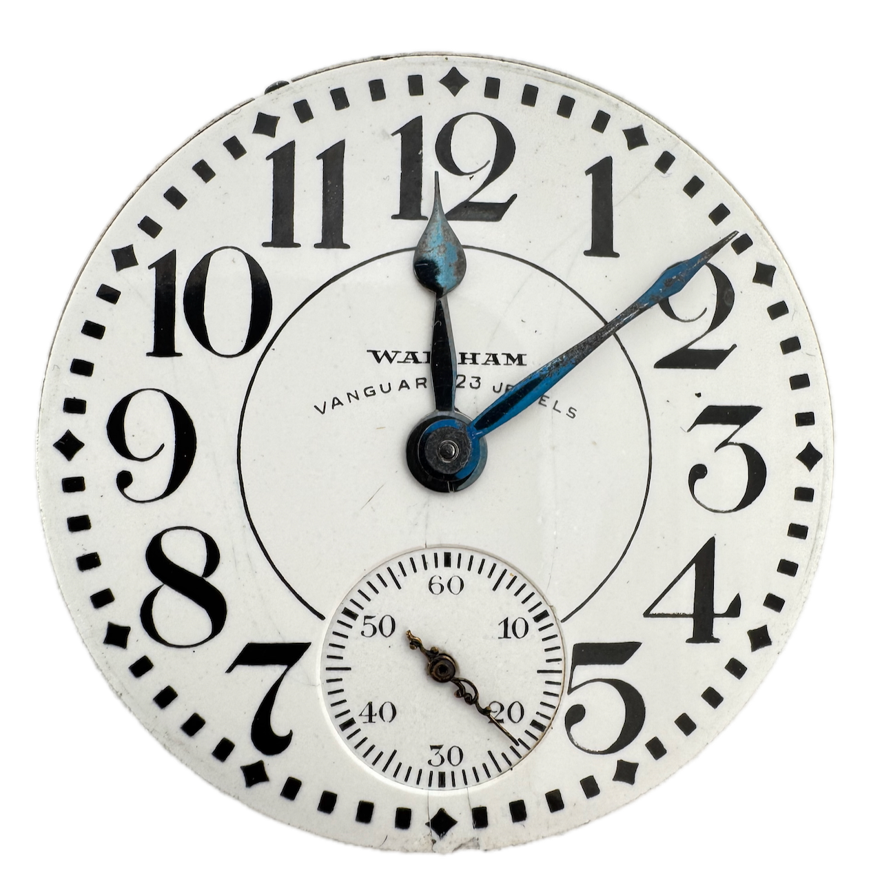 Antique 16s 1932 Waltham 23j Mechanical Railroad Pocket Watch Movement Vanguard Product Description Item: Pocket Watch Movement Brand: Waltham Movement: Mechanical Production Year: 1932 Country: USA Jewels: 23j Gender: Men's Grade: Vanguard Size: 16s Product Measurements Diameter: 43mm Product Condition Overall Condition: Fair, overall condition for its age. Functions: Running, but may be in need of service. This means, it can run unreliably, start or stop and timekeeping is not guaranteed. Dial: The dial has hairline crack(s) on it.